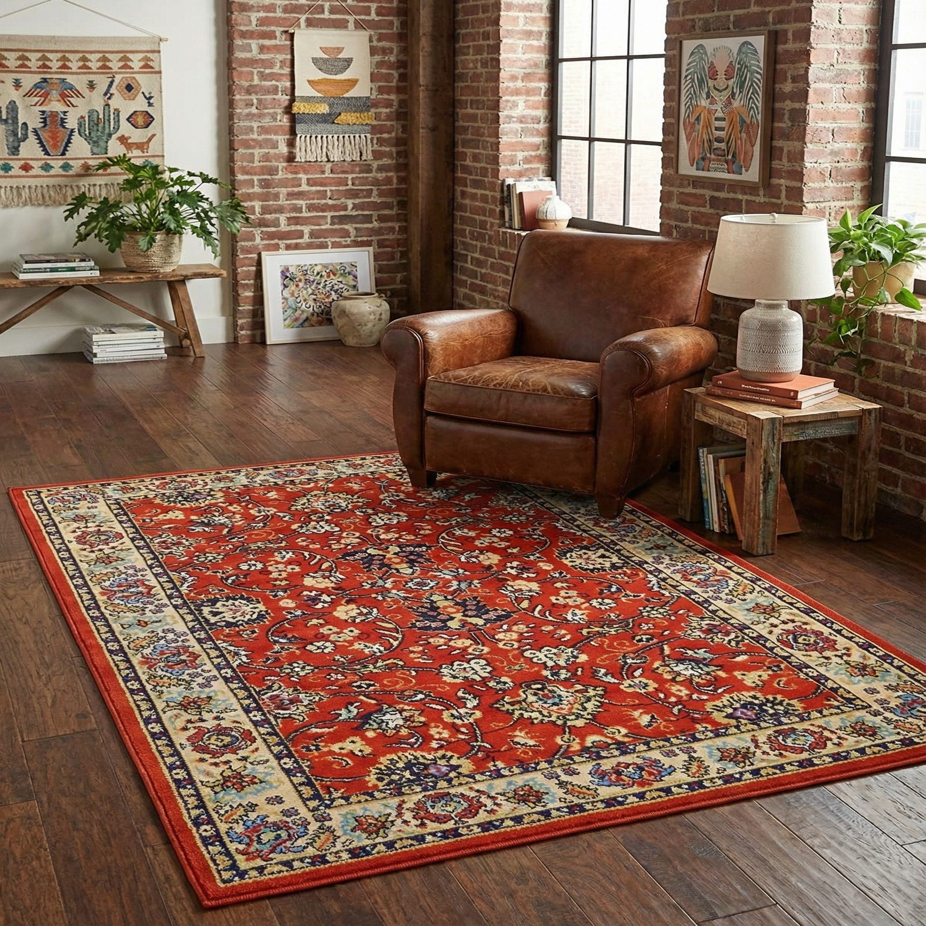 Primary color is Terracotta. Colors in this rug include: Terracotta, Cream, Light Blue, Navy Blue, Orange, Rust Red.