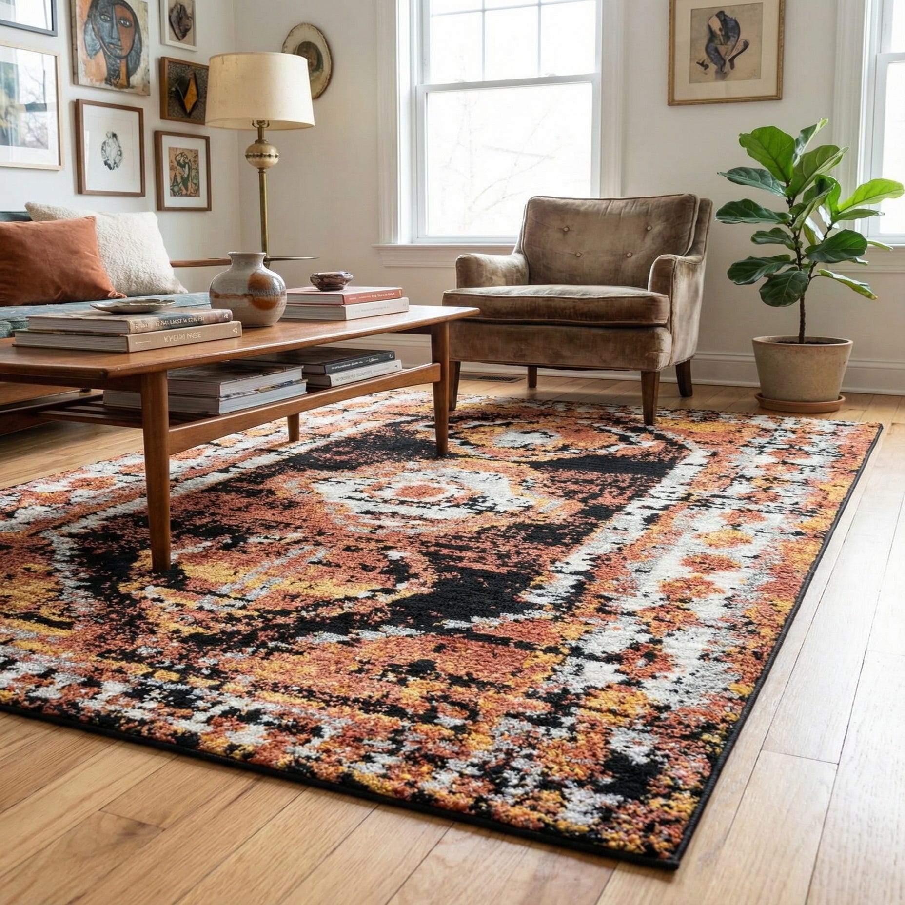 Primary color is Terracotta. Colors in this rug include: Terracotta, Black, Ivory, Light Blue, Yellow.