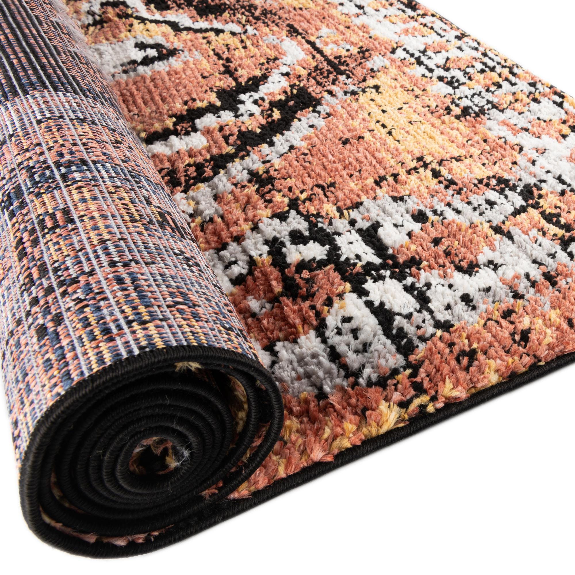 Primary color is Terracotta. Colors in this rug include: Terracotta, Black, Ivory, Light Blue, Yellow.