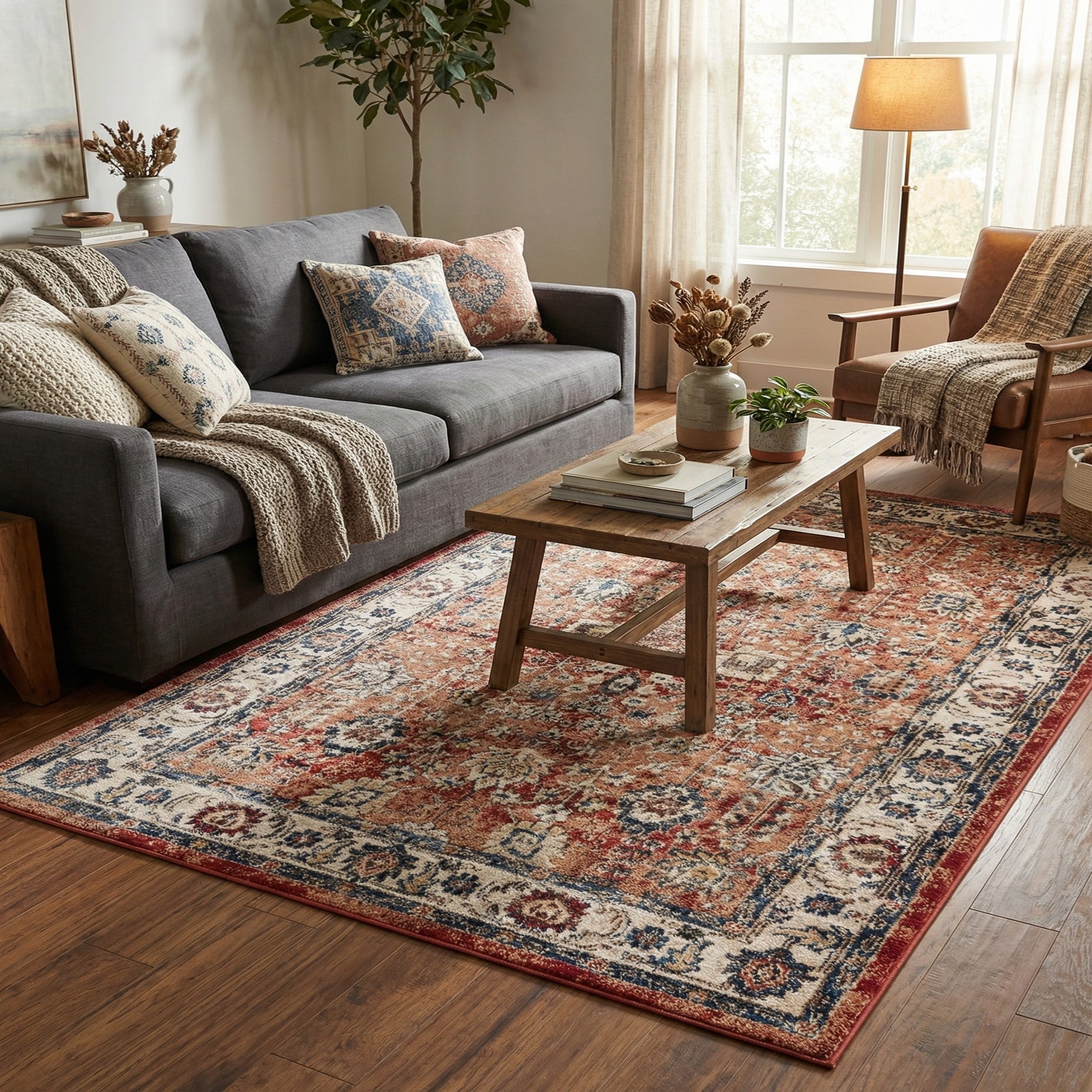 Primary color is Terracotta. Colors in this rug include: Terracotta, Blue, Brown, Burgundy, Cream, Light Blue, Light Brown, Olive.