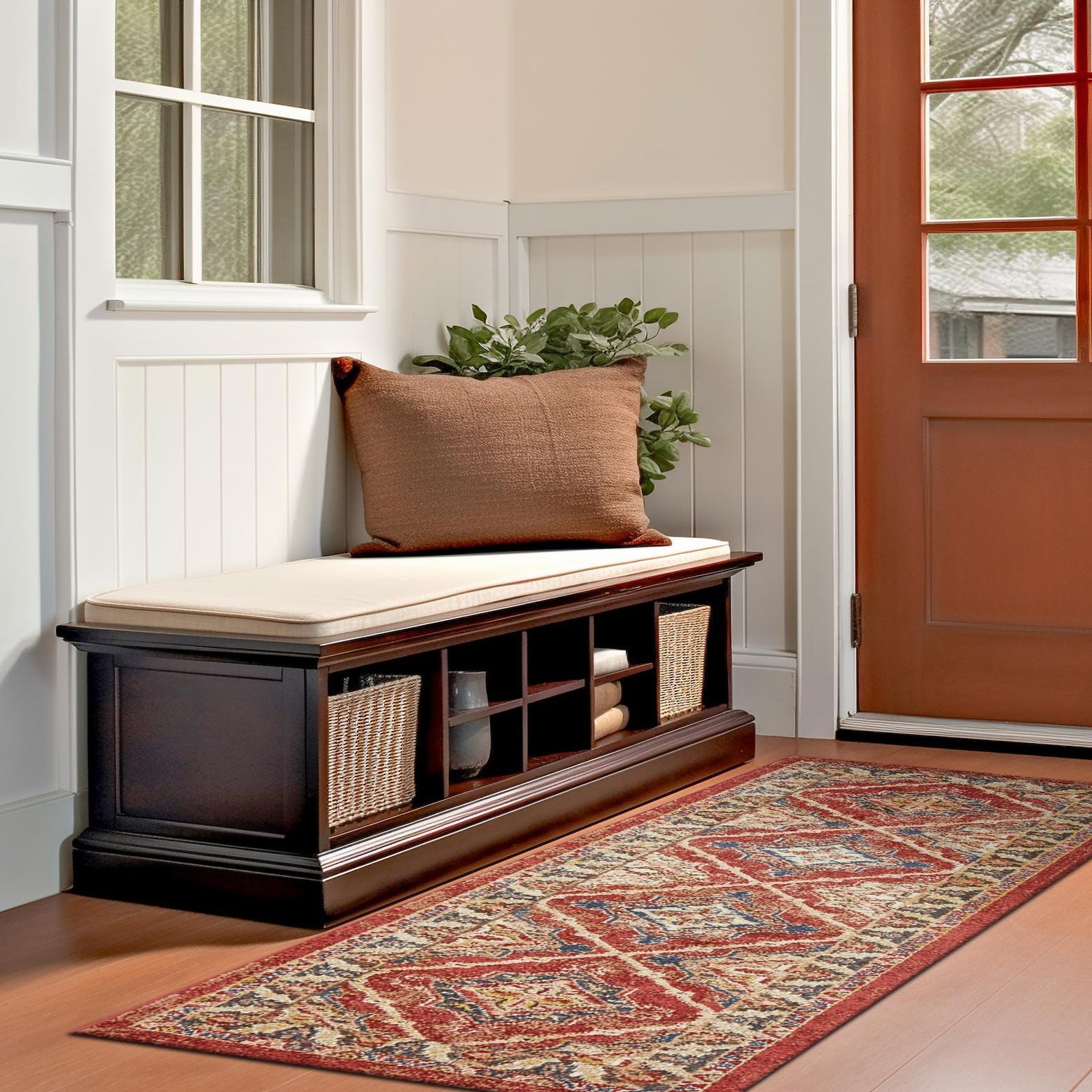 Primary color is Terracotta. Colors in this rug include: Terracotta, Blue, Brown, Burgundy, Cream, Navy Blue, Peach, Gold.