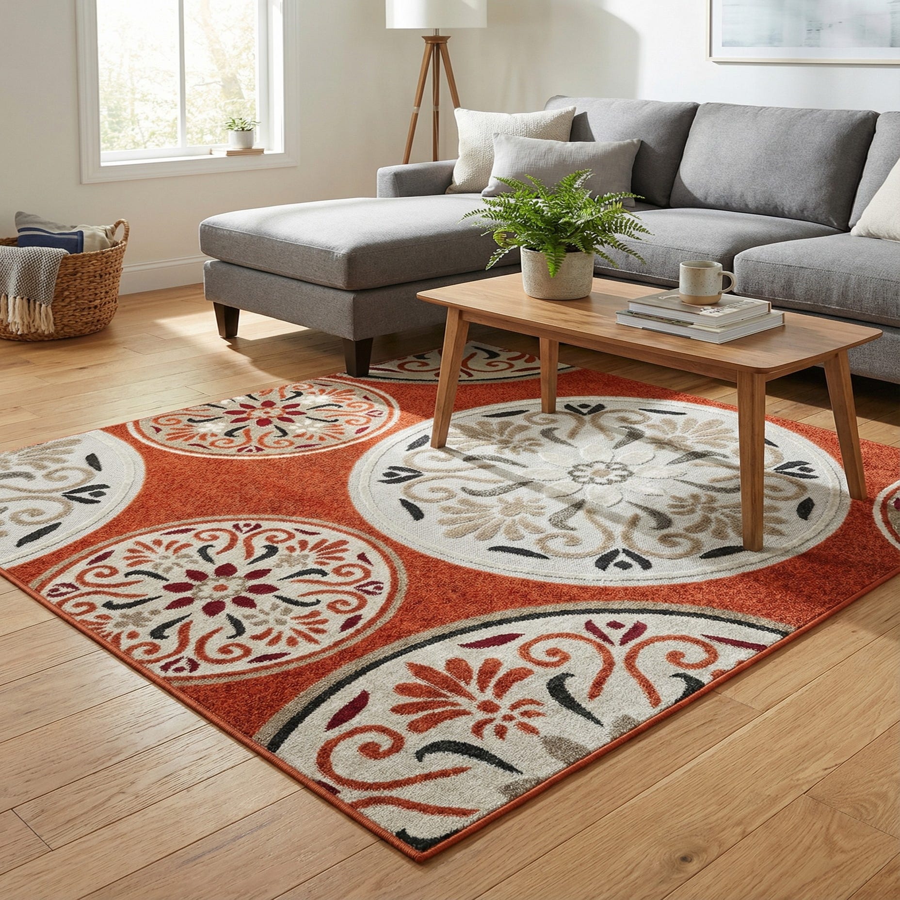 Primary color is Terracotta. Colors in this rug include: Terracotta, Black, Brown, Ivory, Burgundy.