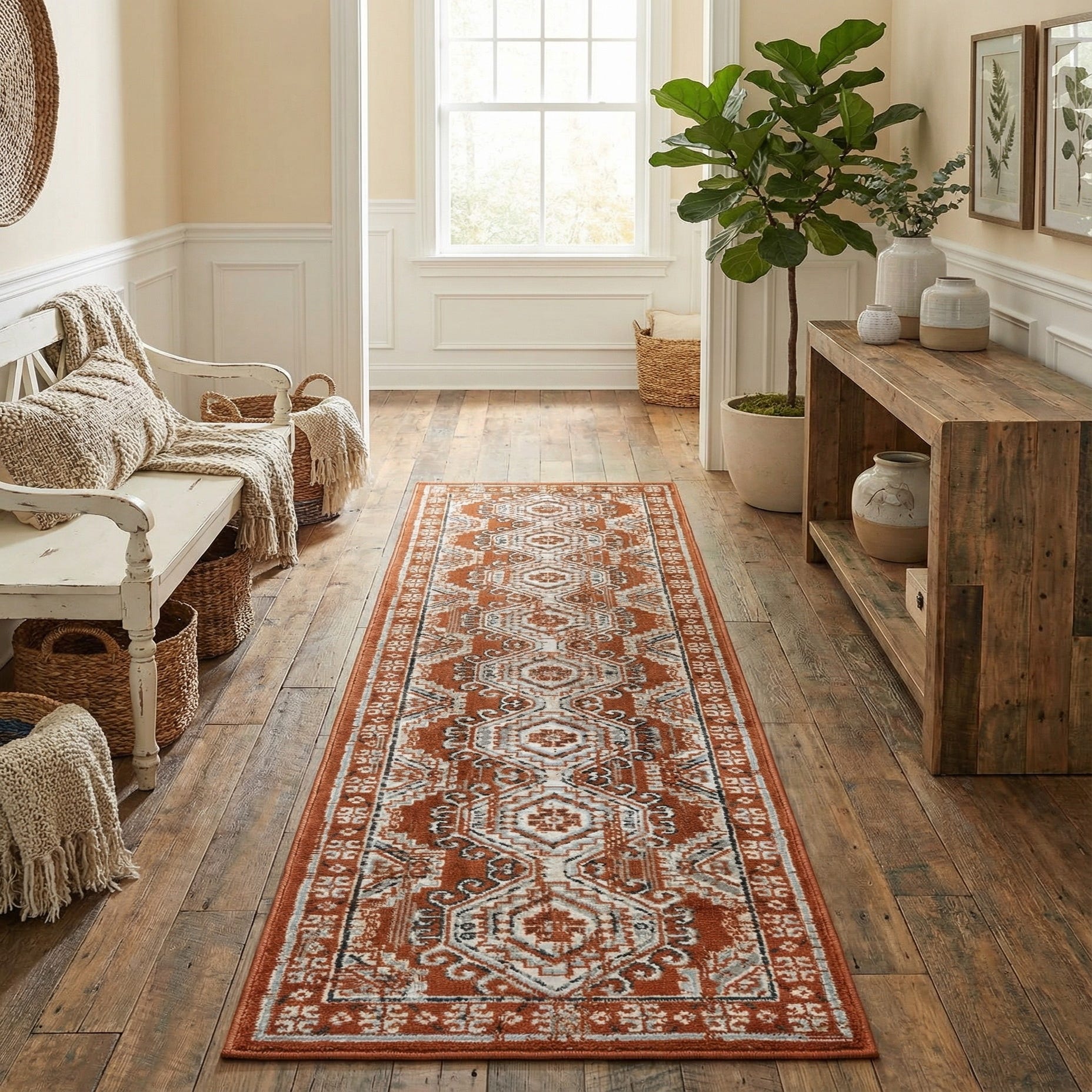 Primary color is Terracotta. Colors in this rug include: Terracotta, Gray, Ivory, Light Blue.