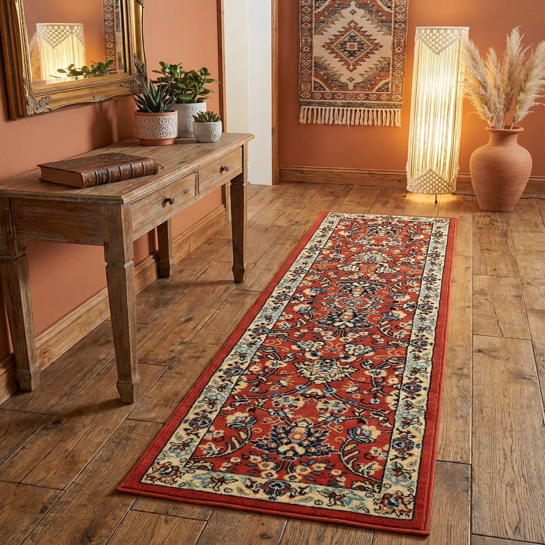 Primary color is Terracotta. Colors in this rug include: Terracotta, Cream, Light Blue, Navy Blue, Orange, Rust Red.