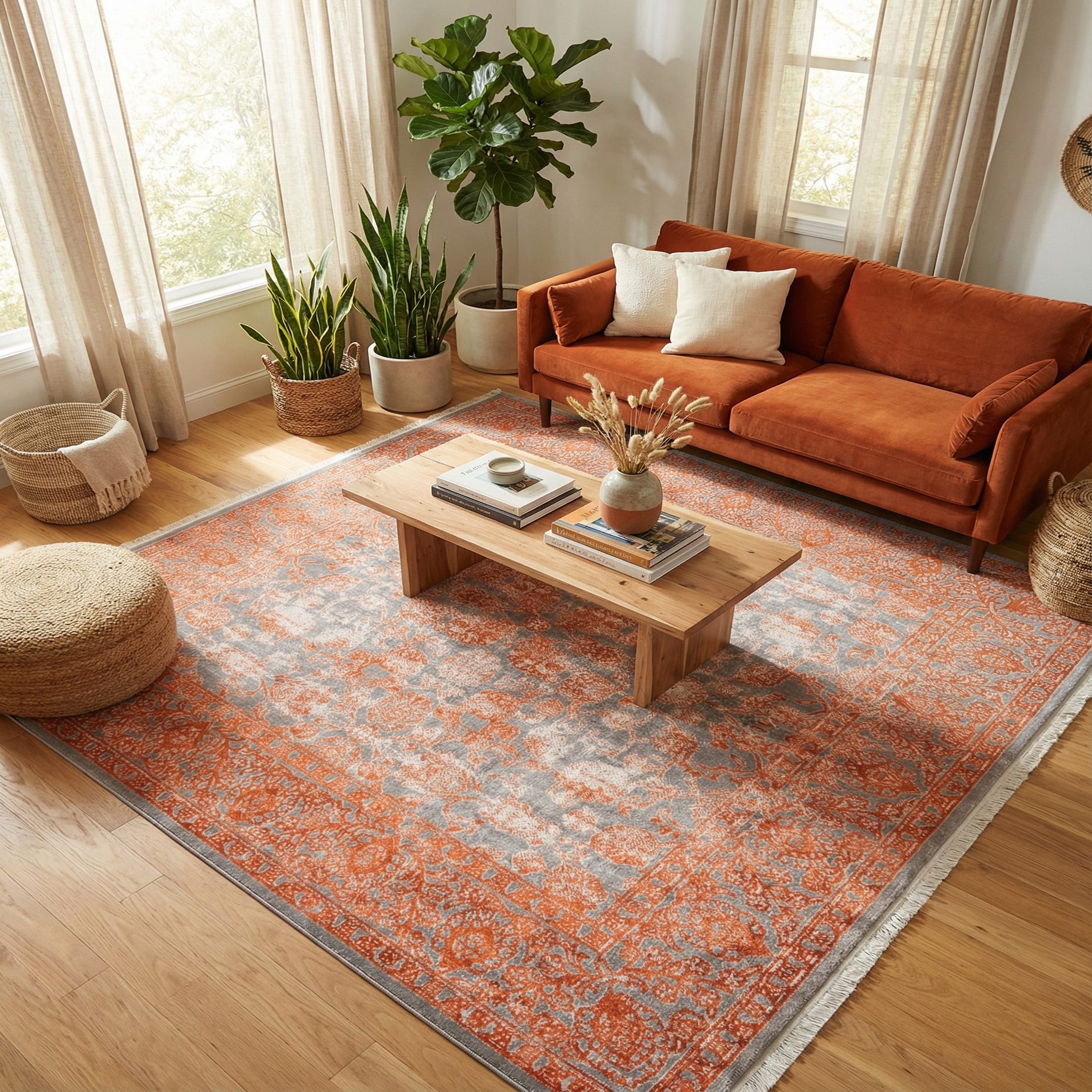Primary color is Terracotta. Colors in this rug include: Terracotta, Gray, Ivory.