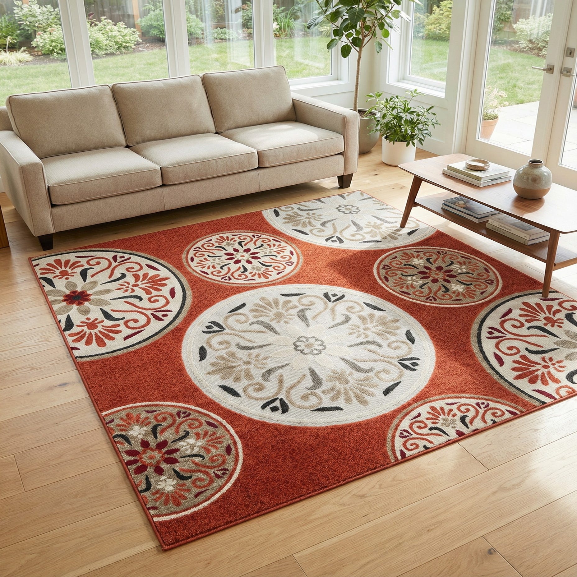 Primary color is Terracotta. Colors in this rug include: Terracotta, Beige, Black, Gray, Orange.