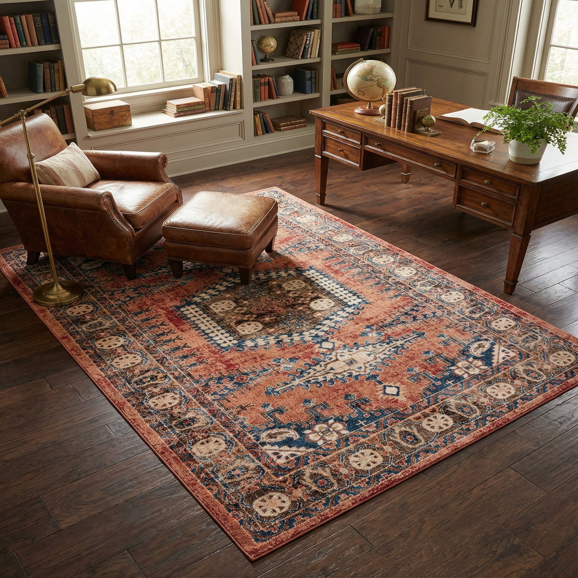 Primary color is Terracotta. Colors in this rug include: Terracotta, Beige, Brown, Burgundy, Light Blue, Peach.