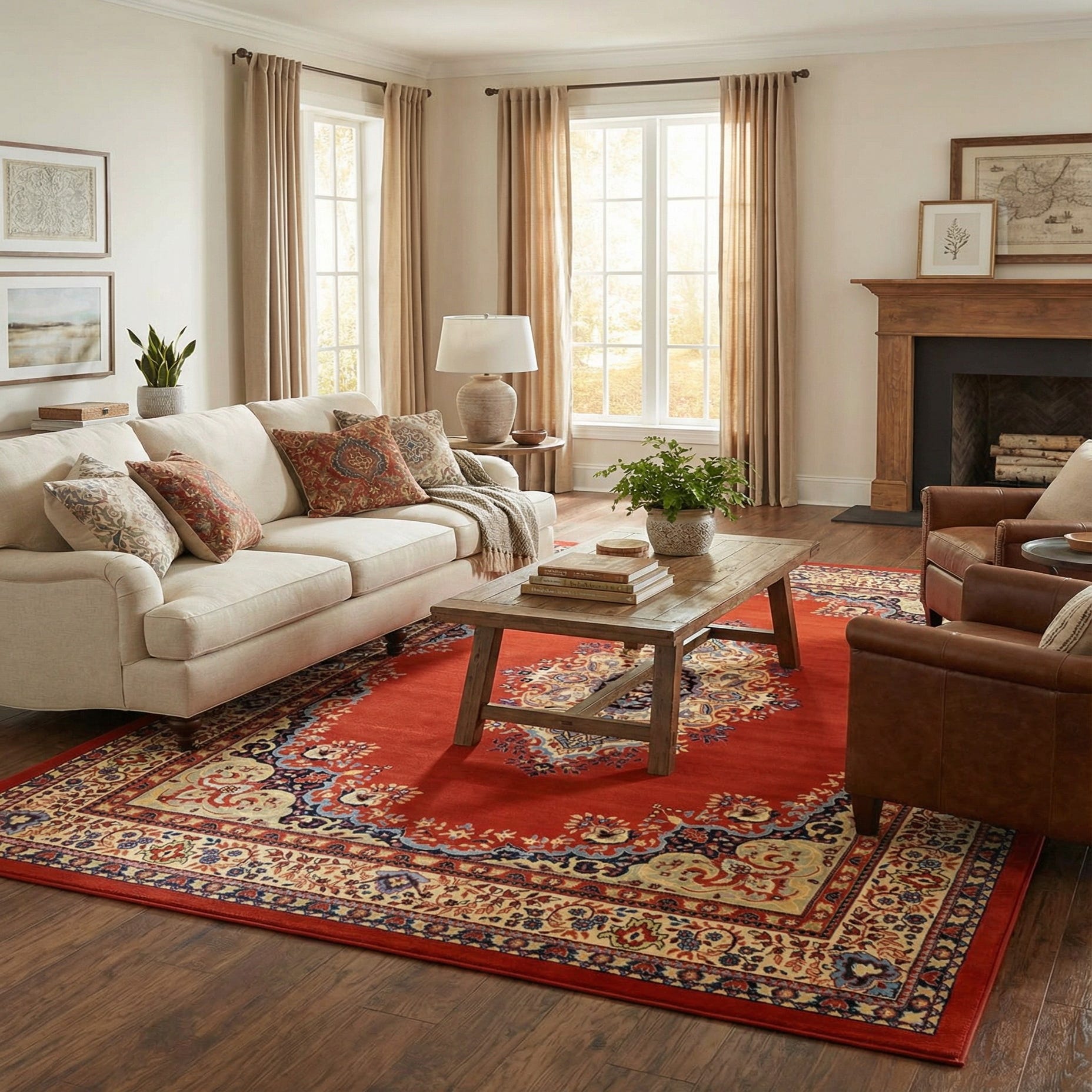Primary color is Terracotta. Colors in this rug include: Terracotta, Cream, Light Blue, Navy Blue.