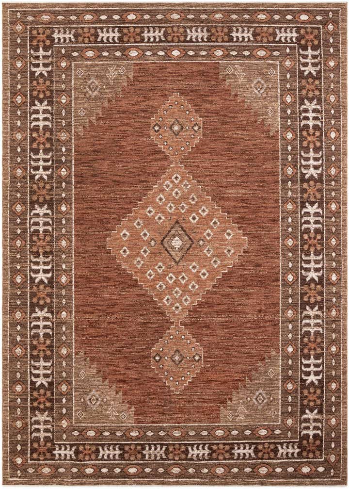 Primary color is Terracotta Rust Red. Colors in this rug include: Terracotta Rust Red, Brown, Ivory, Light Brown.
