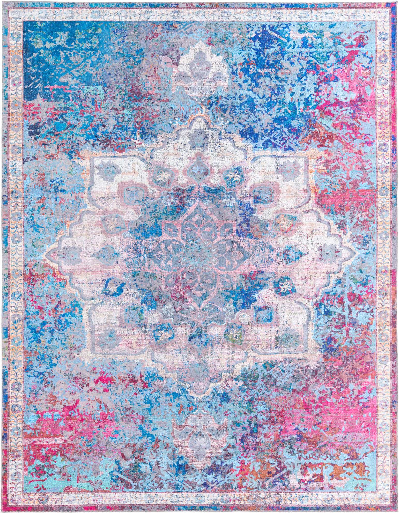 Primary color is Tie Dye. Colors in this rug include: Tie Dye, Gray, Ivory, Light Blue, Purple, Turquoise, Pink.