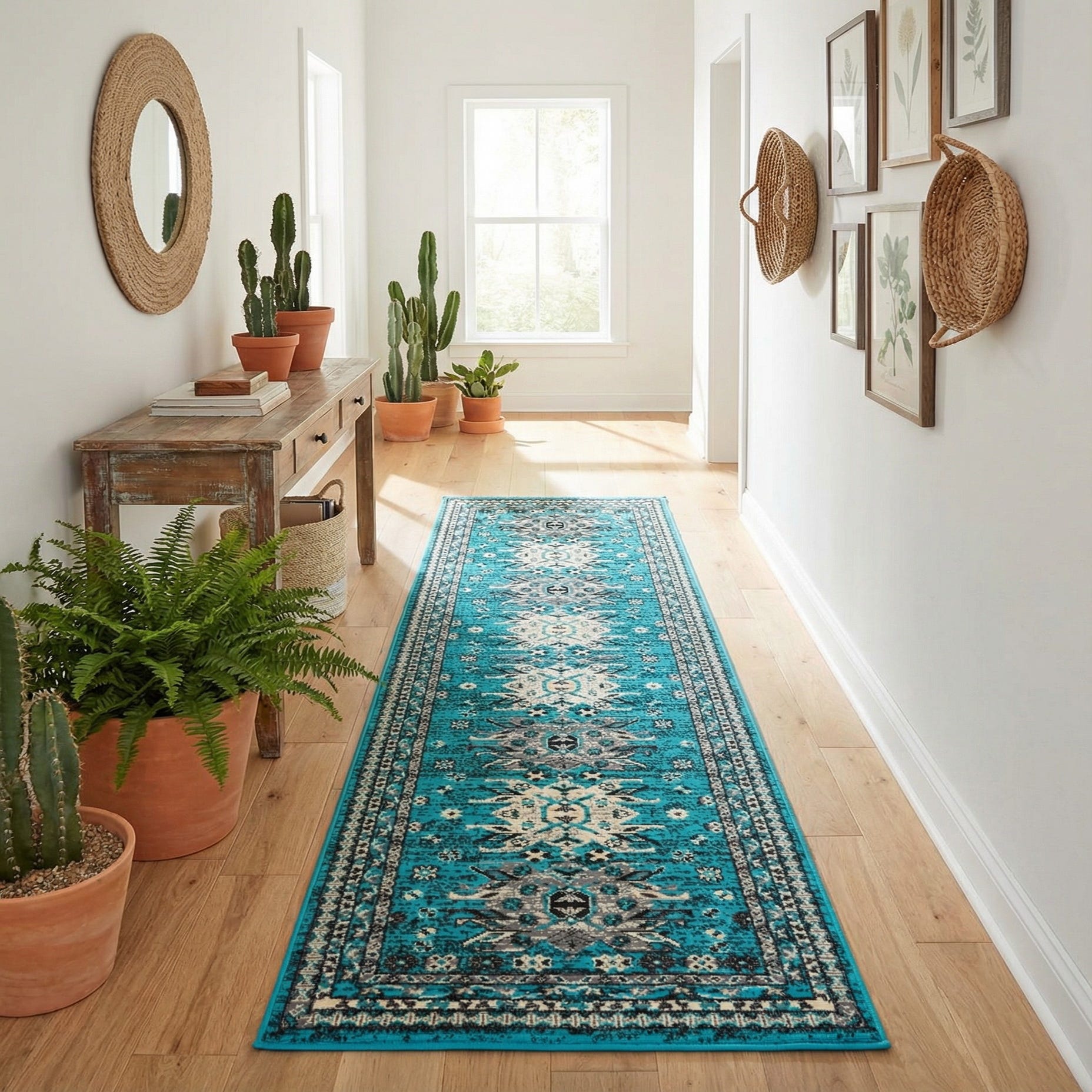 Primary color is Turquoise. Colors in this rug include: Turquoise, Black, Cream, Gray.