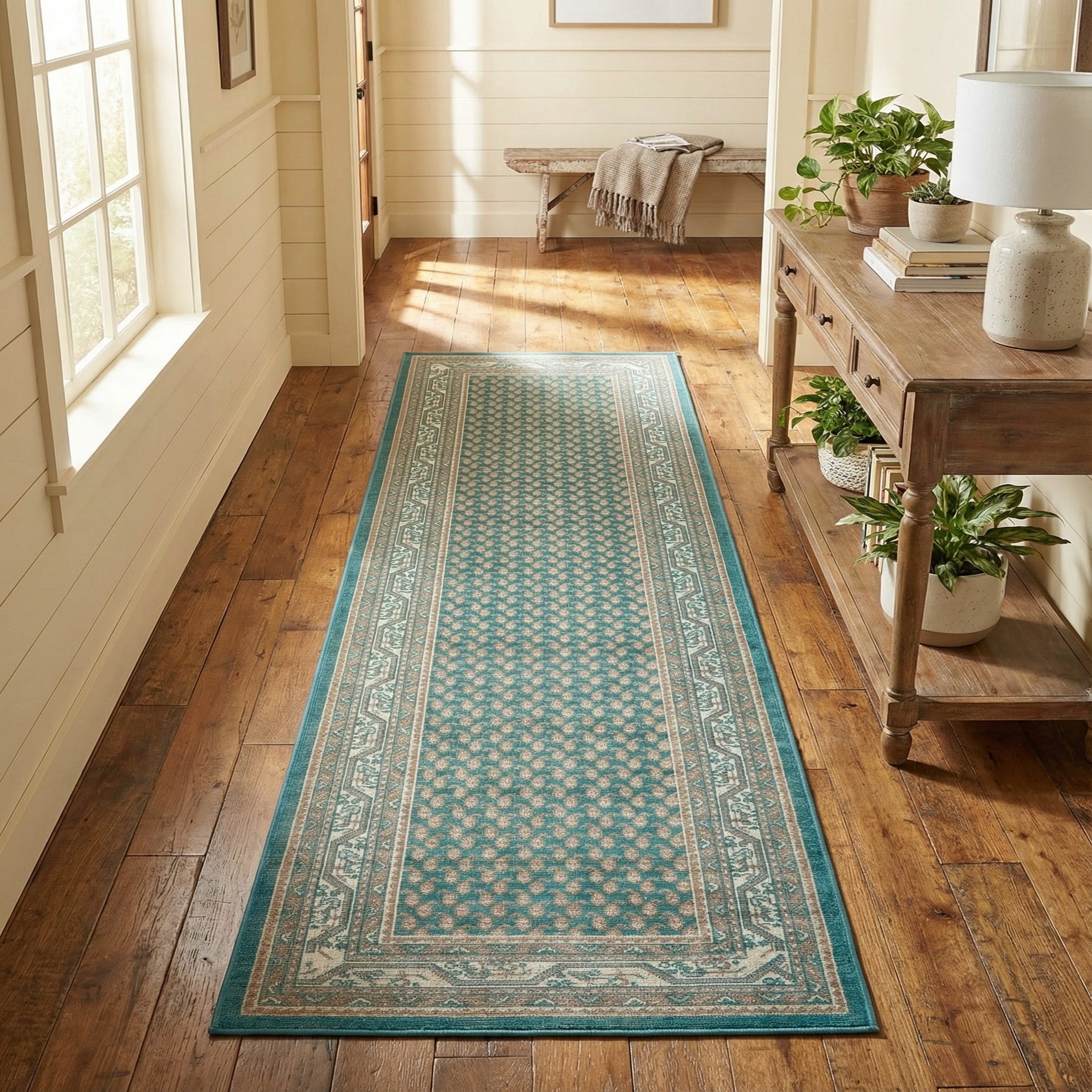 Primary color is Turquoise. Colors in this rug include: Turquoise, Beige, Gray.