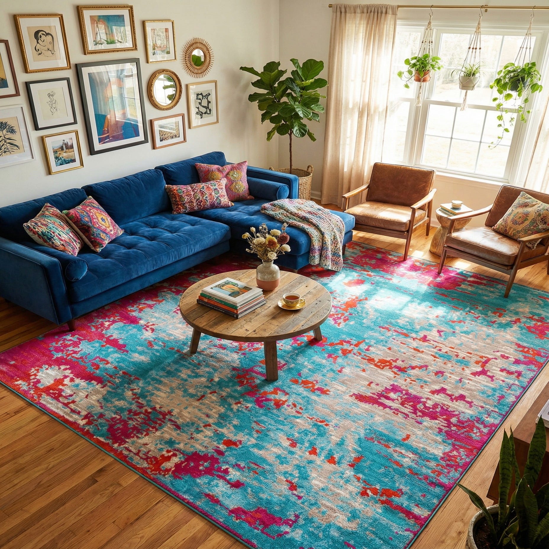 Primary color is Turquoise. Colors in this rug include: Turquoise, Gray, Ivory, Orange, Violet, Light Blue.