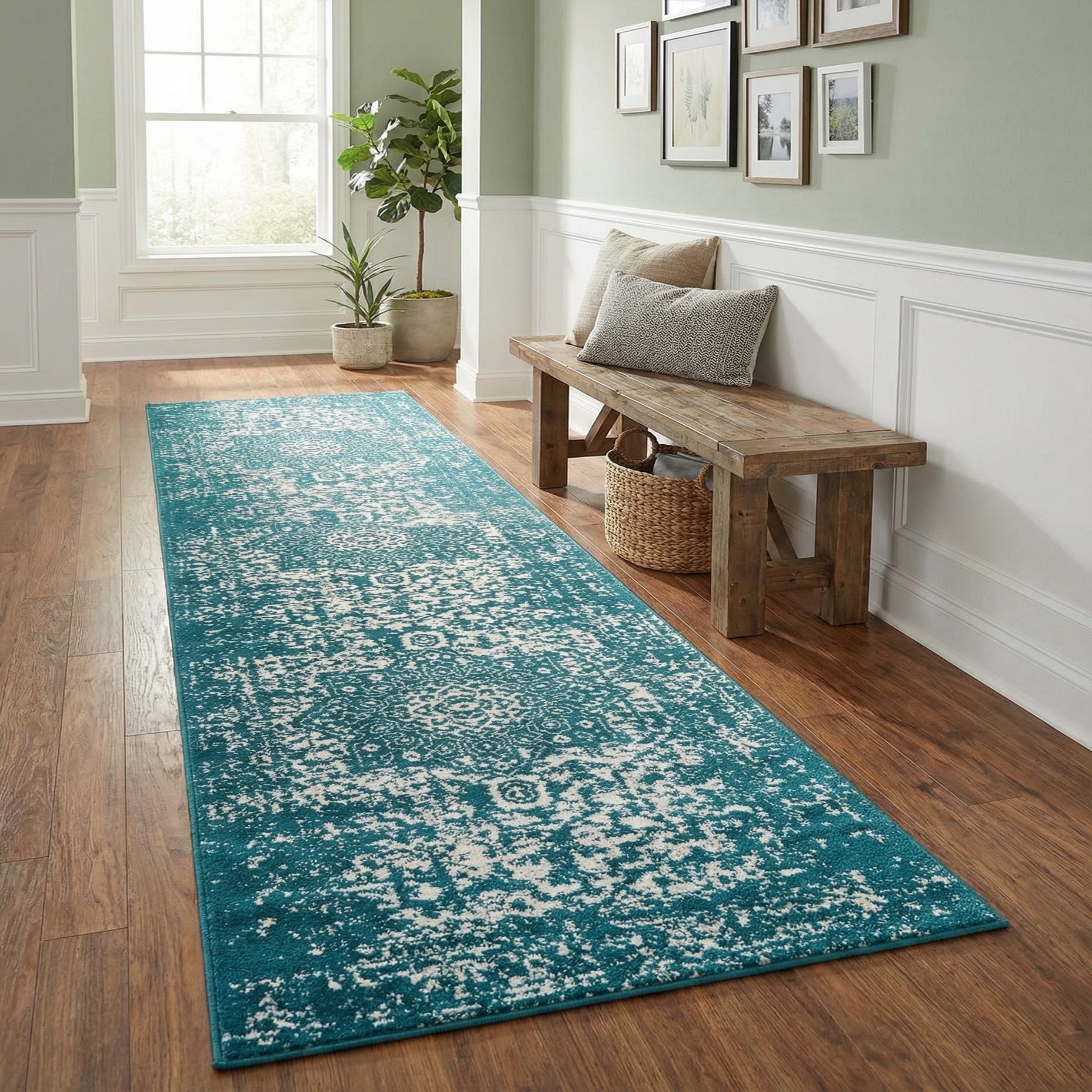 Primary color is Turquoise. Colors in this rug include: Turquoise, Ivory.