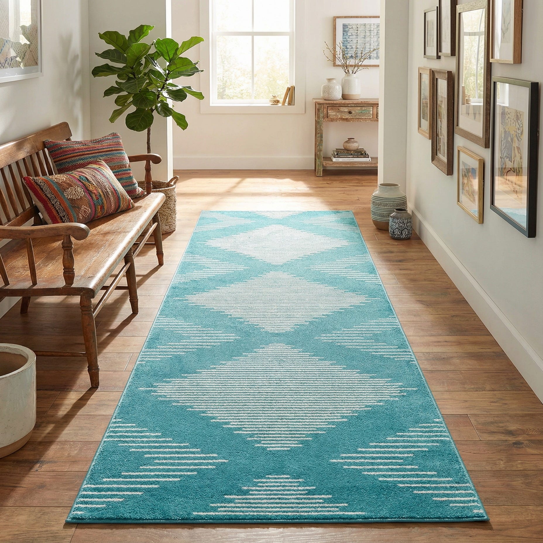 Primary color is Turquoise. Colors in this rug include: Turquoise, Ivory.