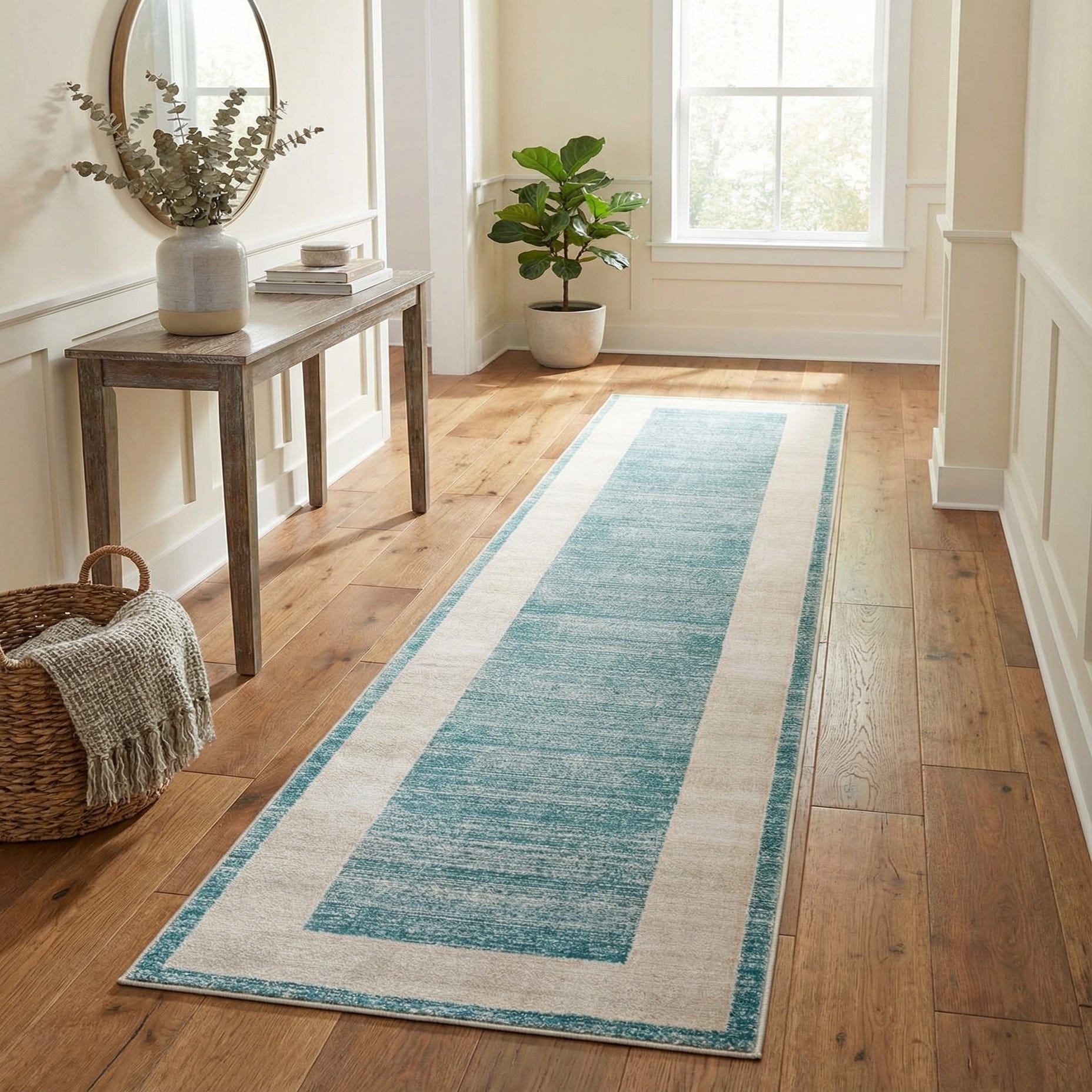 Primary color is Turquoise. Colors in this rug include: Turquoise, Ivory.