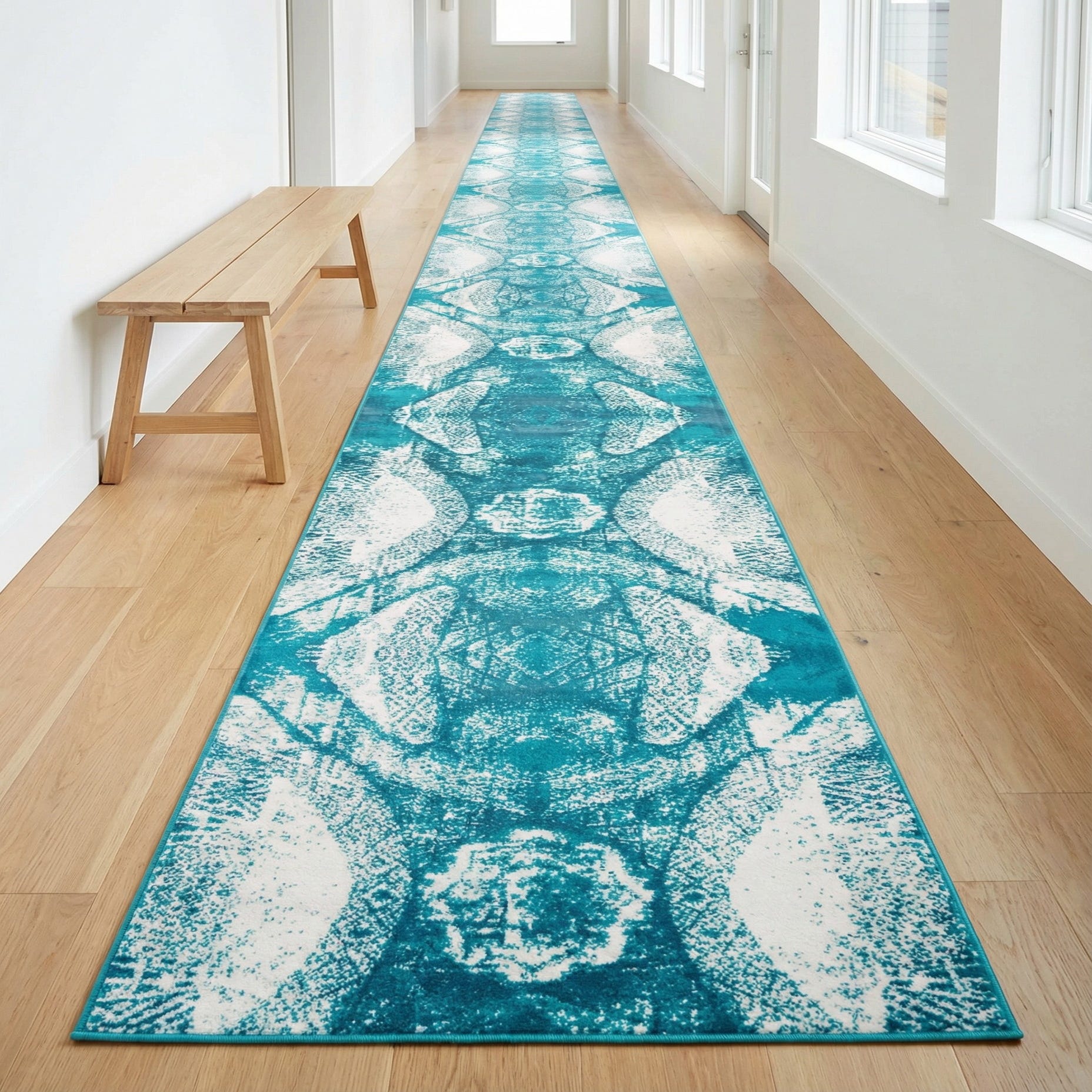 Primary color is Turquoise. Colors in this rug include: Turquoise, Blue, Ivory.