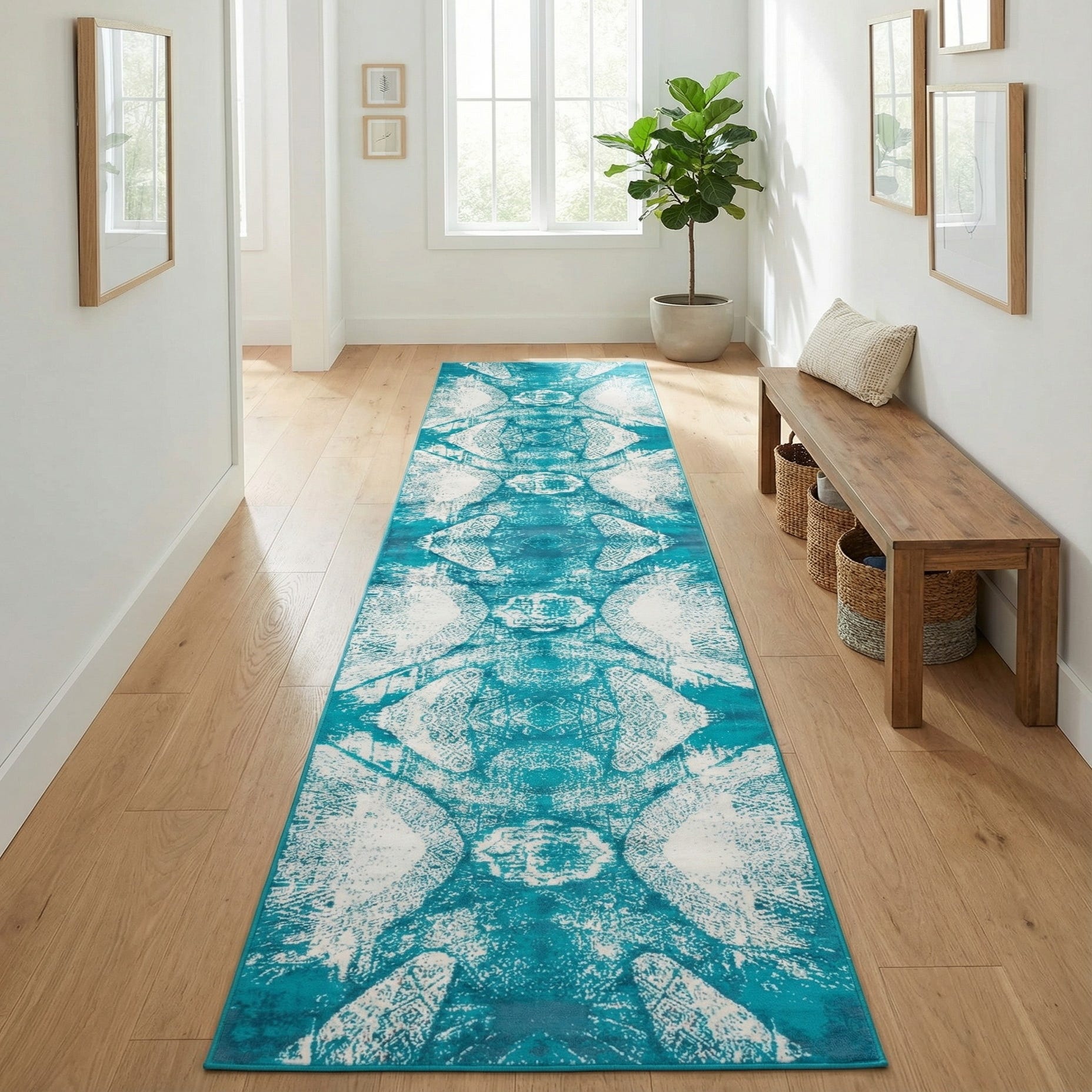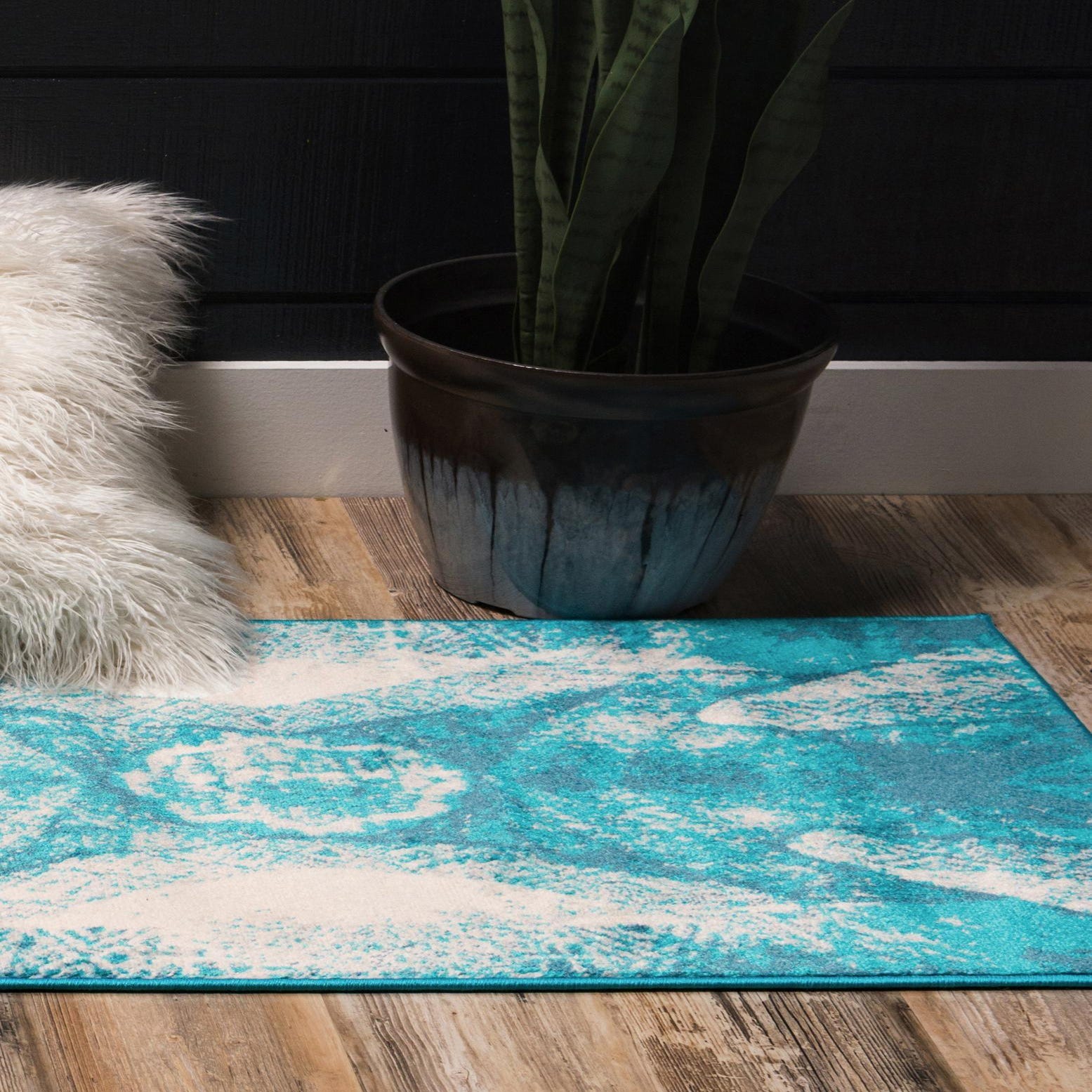 Primary color is Turquoise. Colors in this rug include: Turquoise, Blue, Ivory.