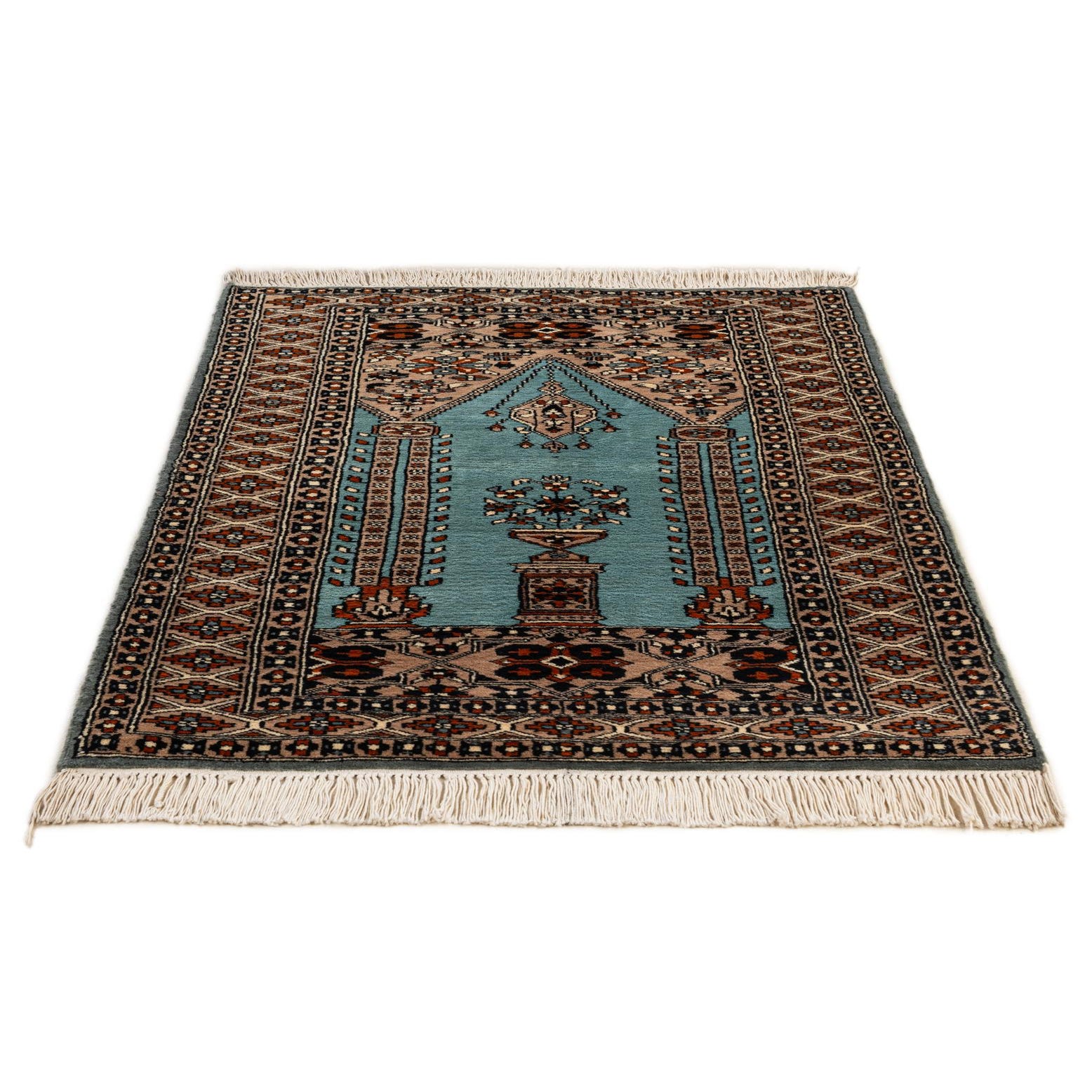 Primary color is Turquoise. Colors in this rug include: Turquoise, Beige, Brown, Ivory, Navy Blue, Terracotta.