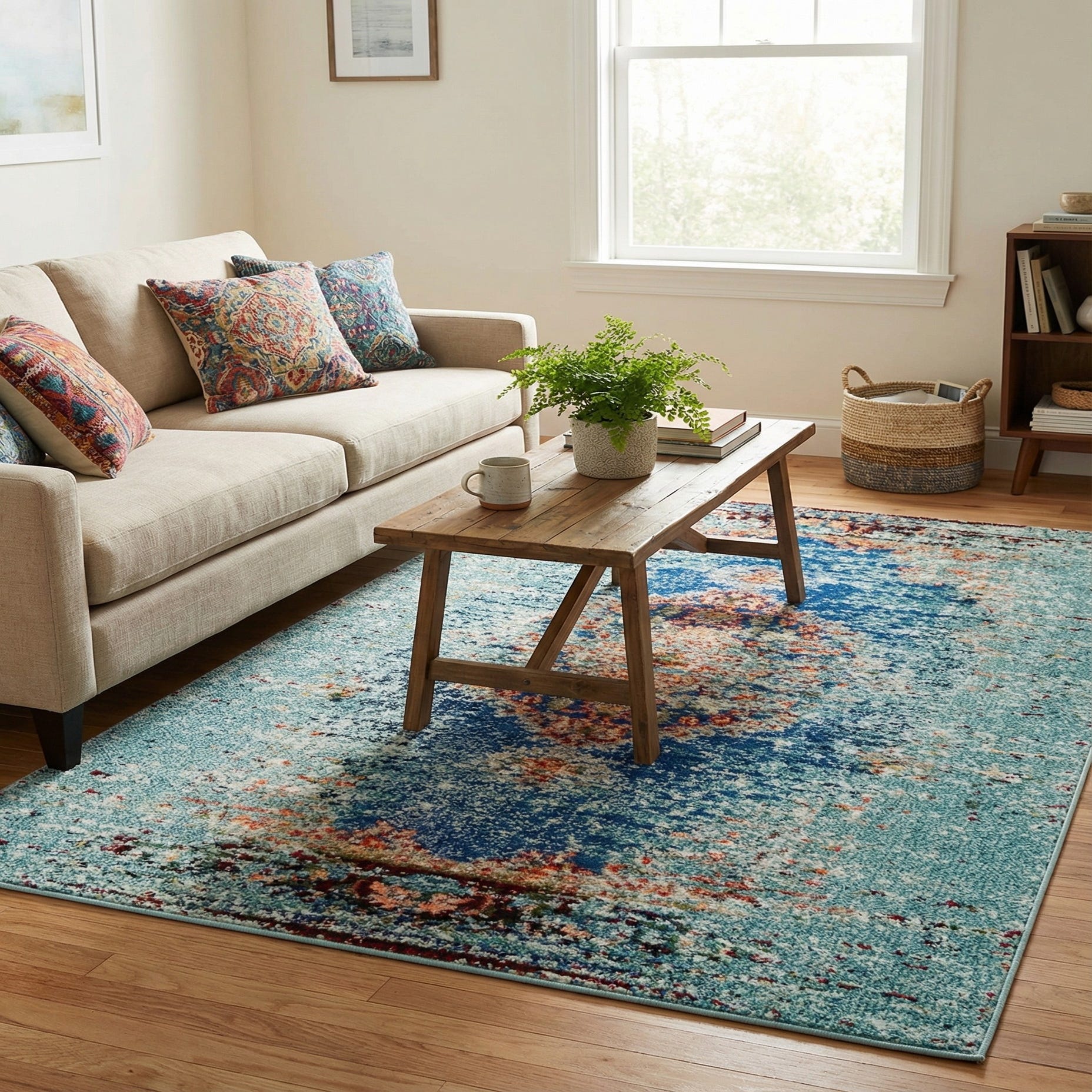Primary color is Turquoise. Colors in this rug include: Turquoise, Beige, Green, Navy Blue, Orange, Red.