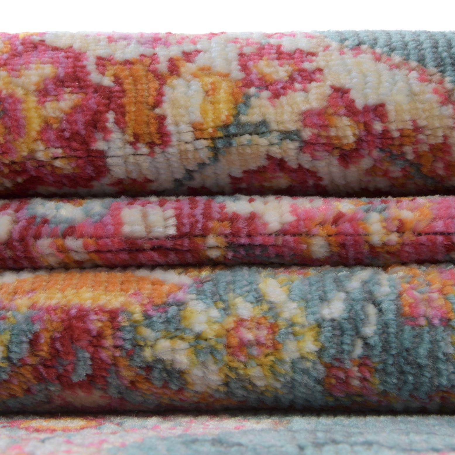 Primary color is Turquoise. Colors in this rug include: Turquoise, Ivory, Olive, Orange, Red, Violet, Pink.