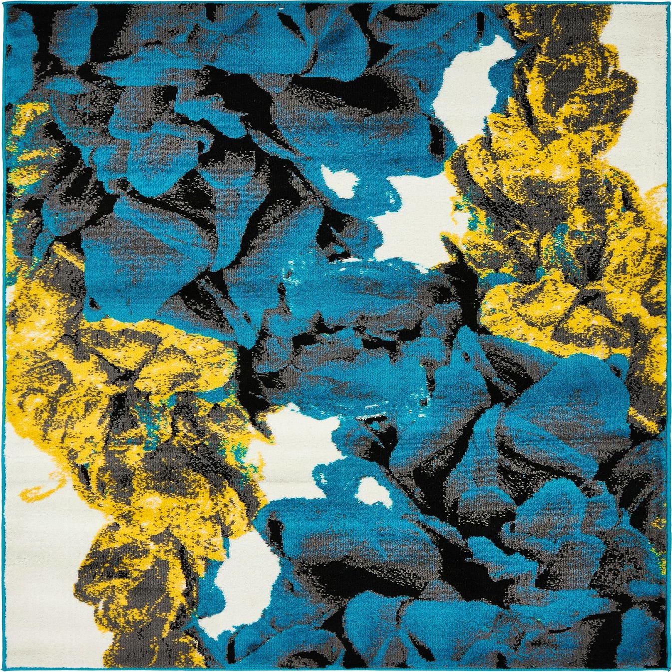 Primary color is Turquoise. Colors in this rug include: Turquoise, Black, Gray, Yellow, Ivory.
