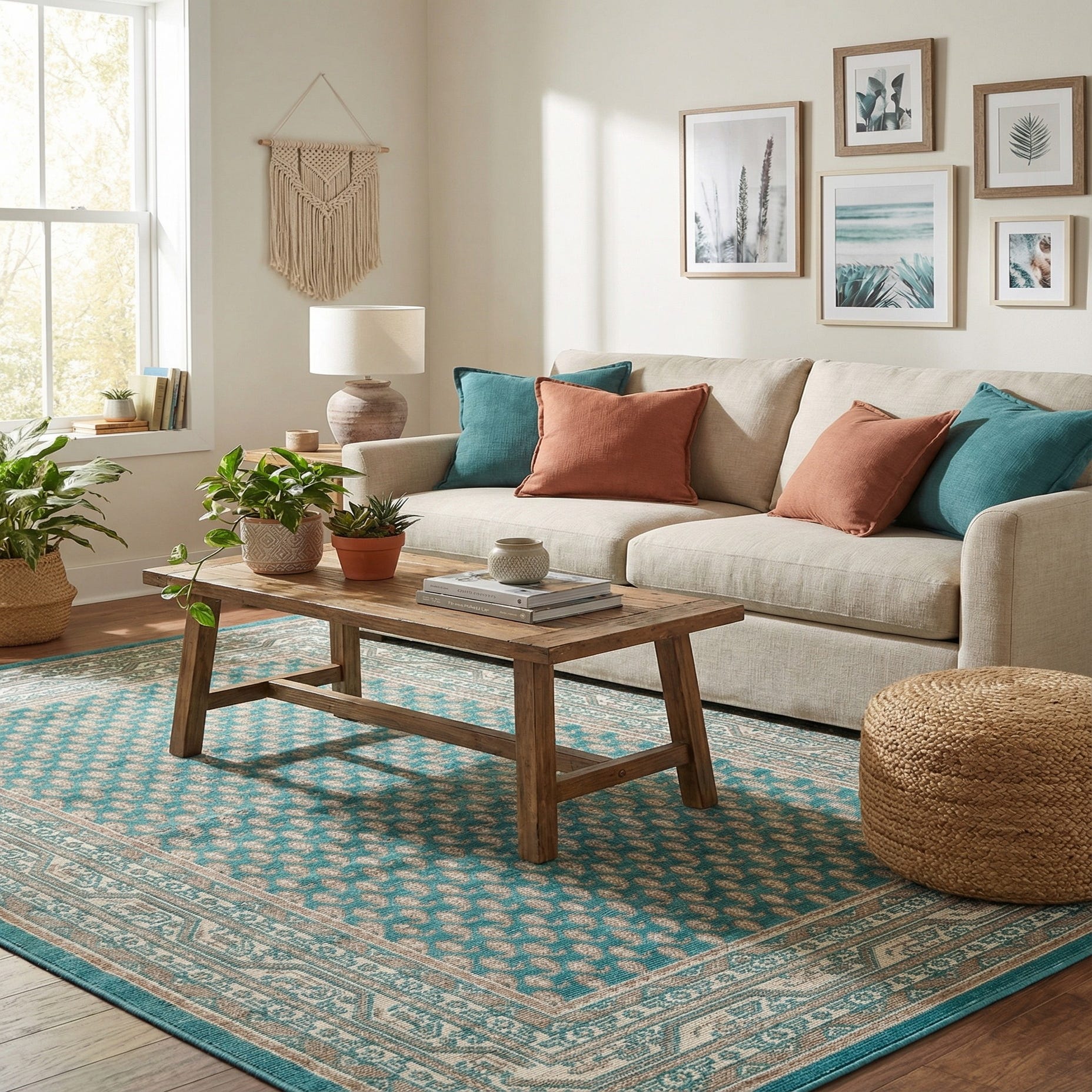 Primary color is Turquoise. Colors in this rug include: Turquoise, Beige, Gray.