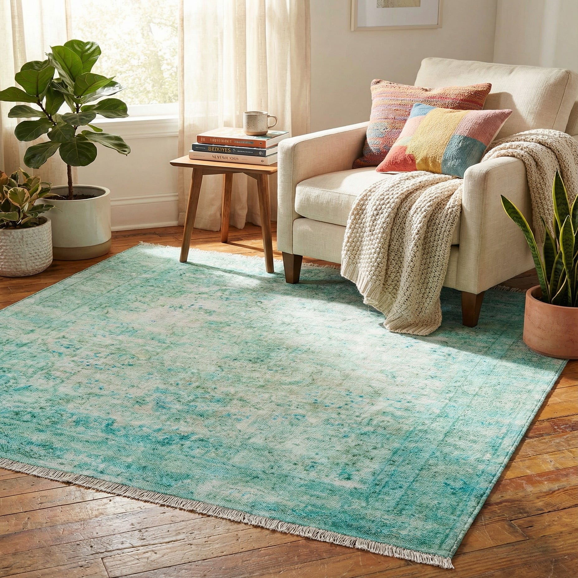 Primary color is Turquoise. Colors in this rug include: Turquoise, Ivory, Green.