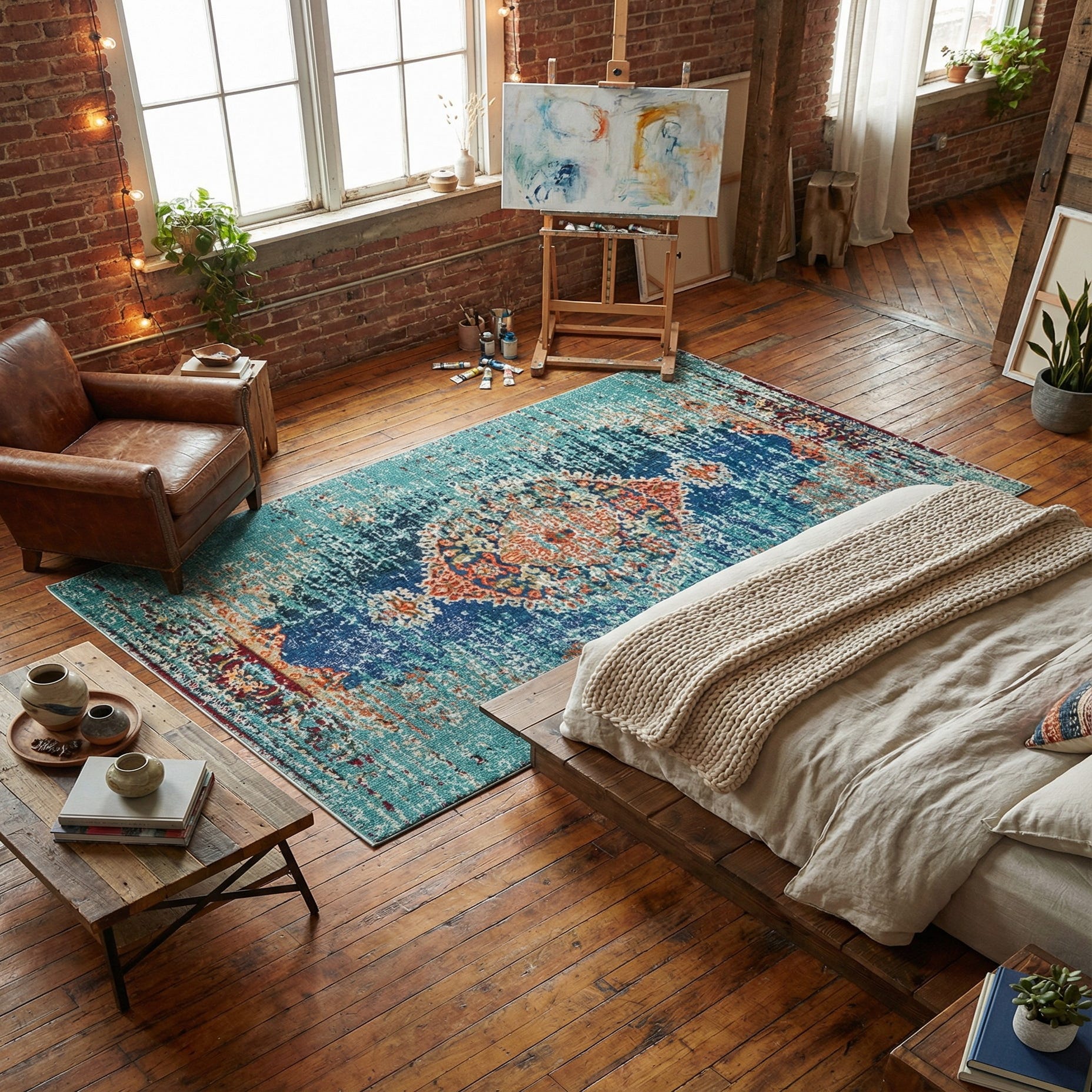 Primary color is Turquoise. Colors in this rug include: Turquoise, Beige, Green, Navy Blue, Orange, Red.