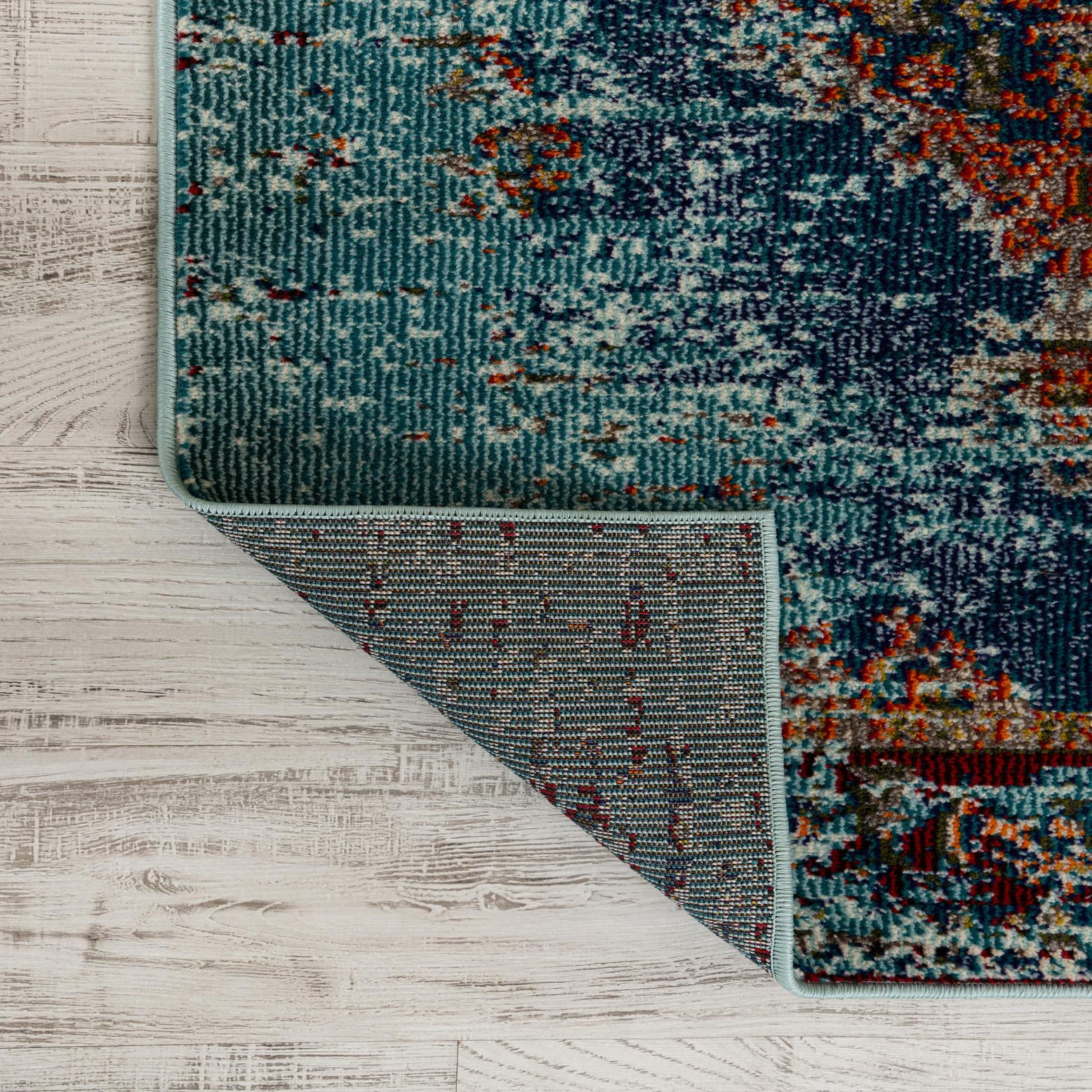 Primary color is Turquoise. Colors in this rug include: Turquoise, Beige, Green, Navy Blue, Orange, Red.