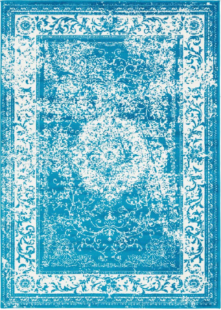 Primary color is Turquoise. Colors in this rug include: Turquoise, Ivory.