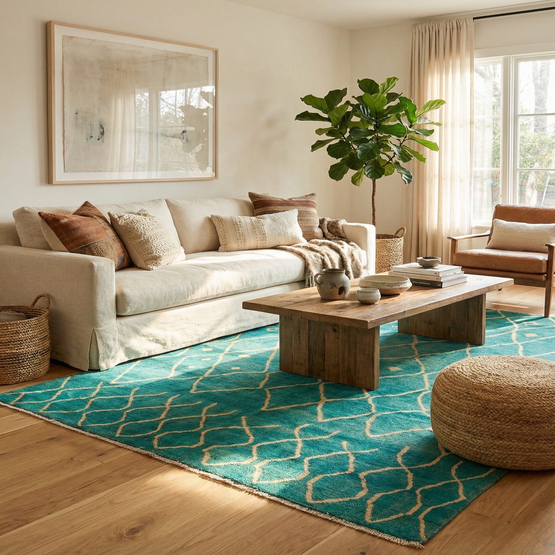 Primary color is Turquoise. Colors in this rug include: Turquoise, Ivory.