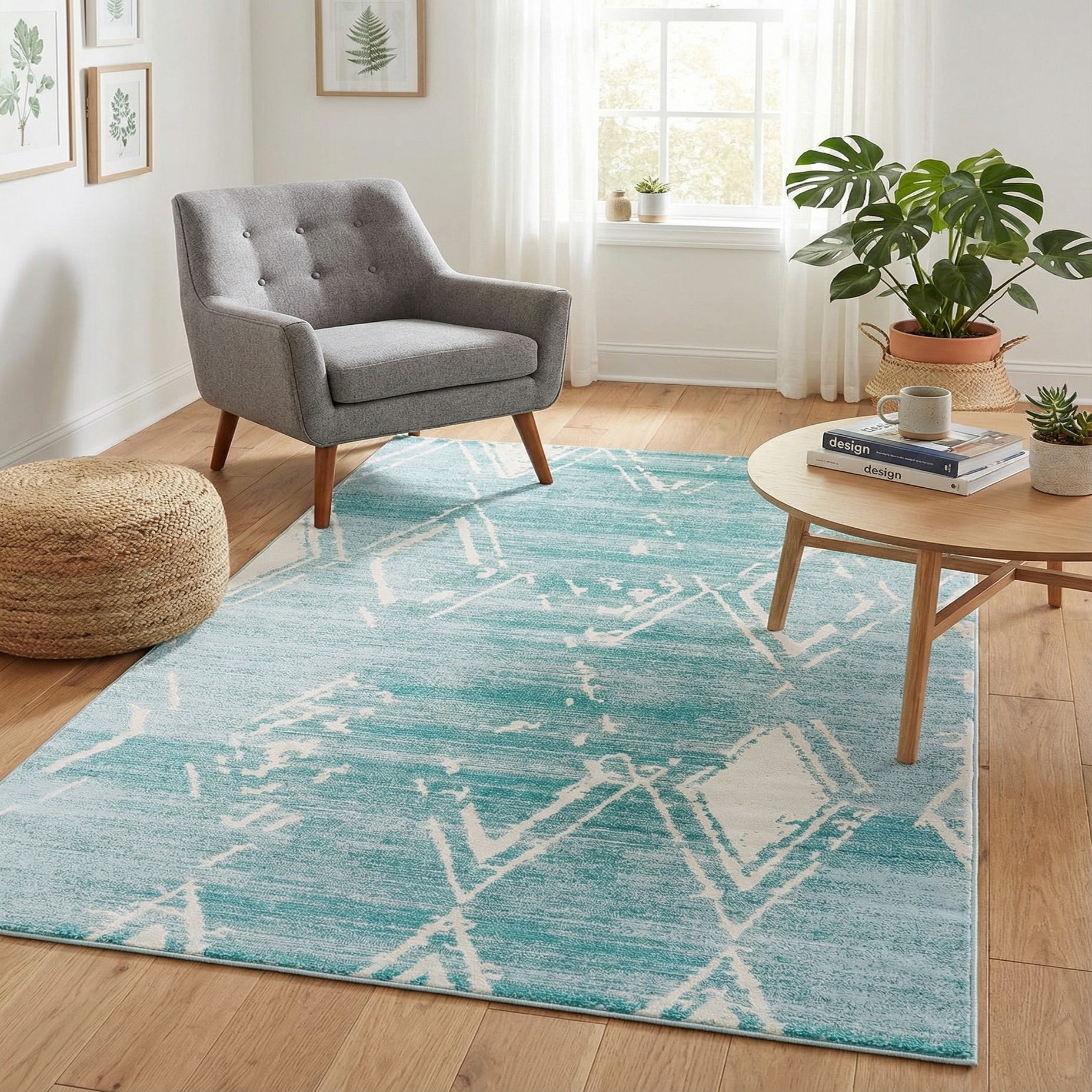 Primary color is Turquoise. Colors in this rug include: Turquoise, Ivory, Light Blue.