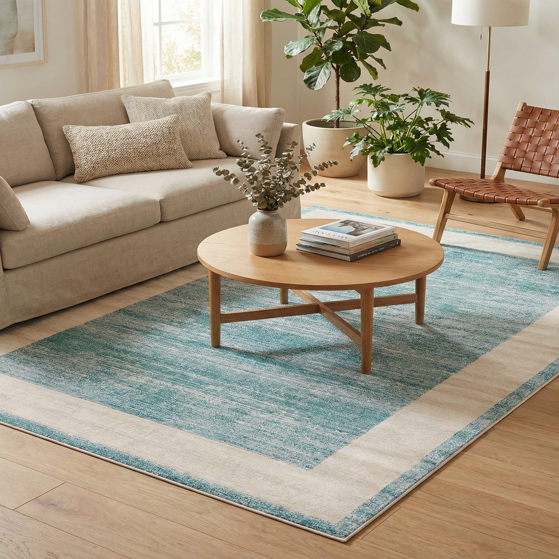 Primary color is Turquoise. Colors in this rug include: Turquoise, Ivory.