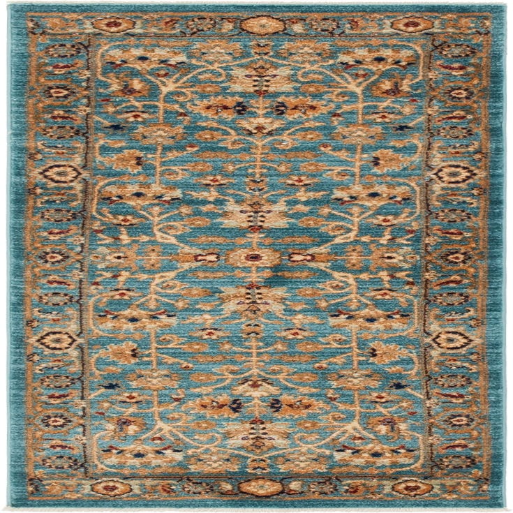 Primary color is Turquoise. Colors in this rug include: Turquoise, Navy Blue, Orange, Red, Ivory, Light Blue.