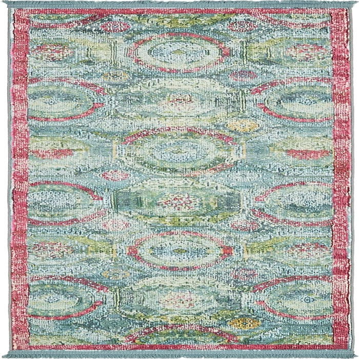 Primary color is Turquoise. Colors in this rug include: Turquoise, Gold, Green, Red, Ivory.