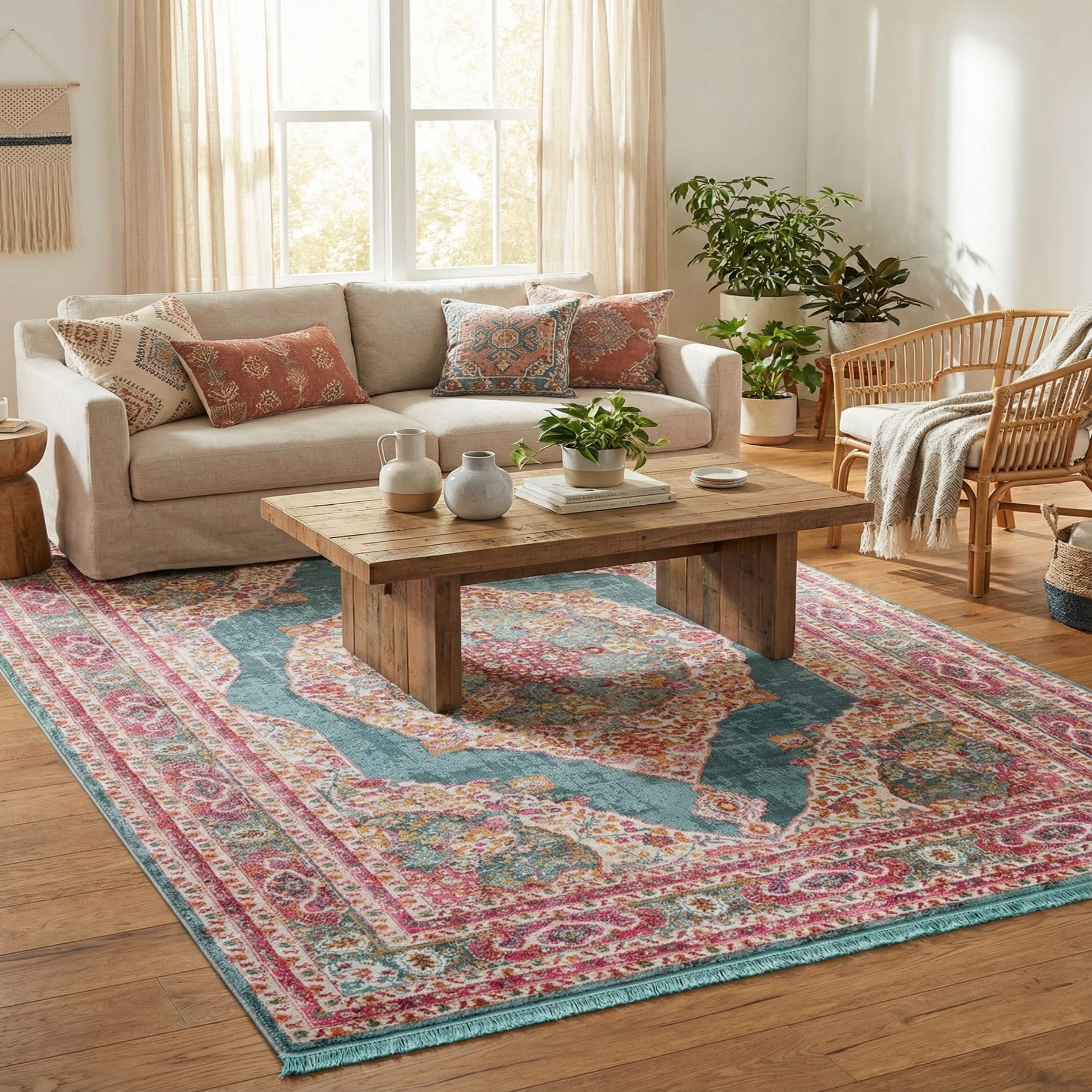Primary color is Turquoise. Colors in this rug include: Turquoise, Ivory, Olive, Orange, Red, Violet, Pink.