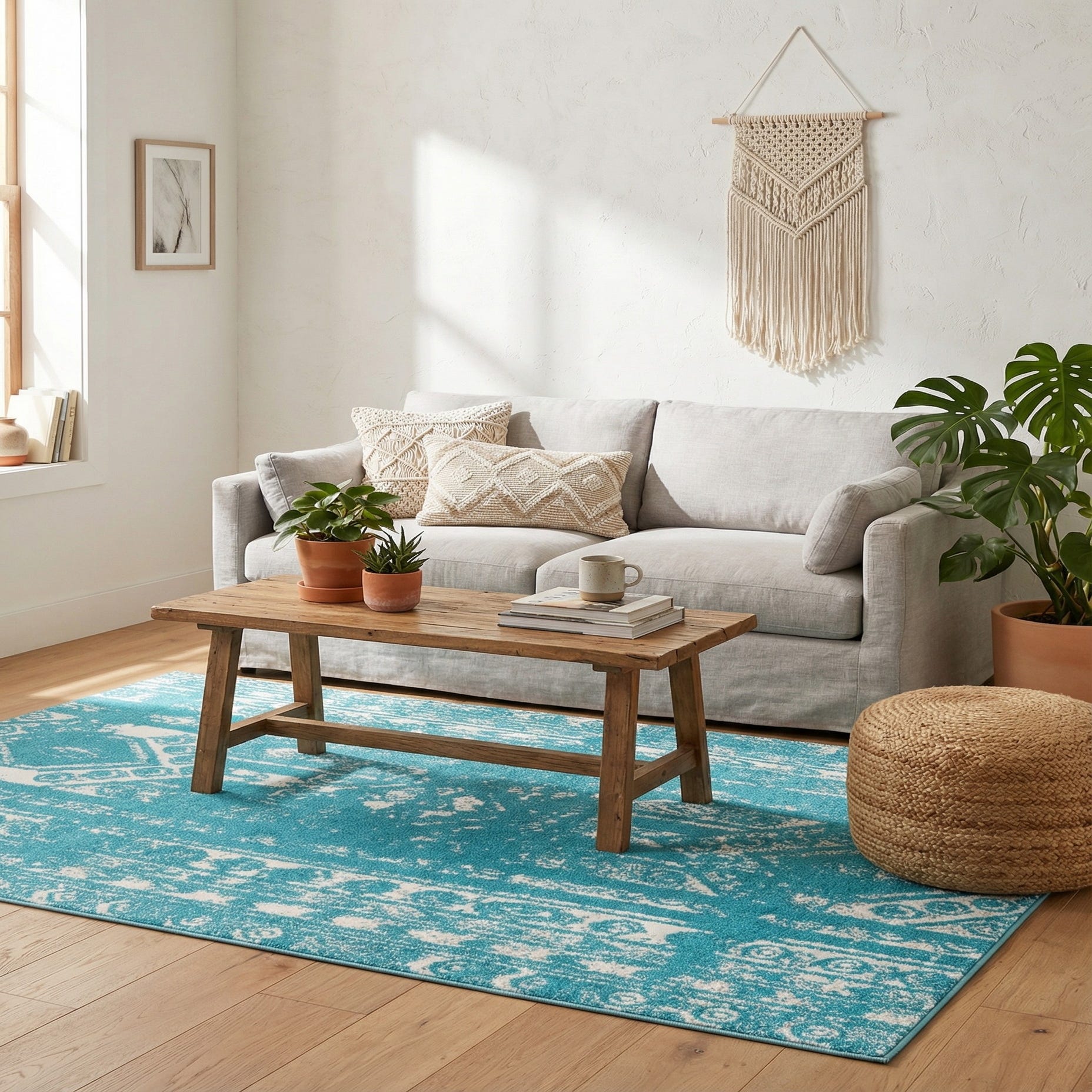 Primary color is Turquoise. Colors in this rug include: Turquoise, Ivory.