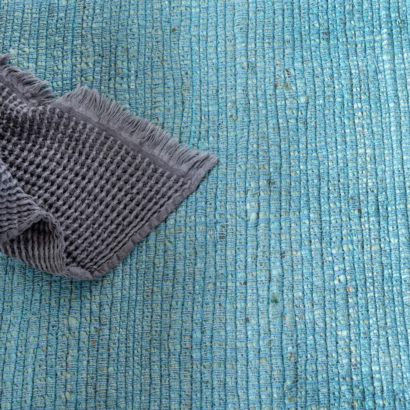 Primary color is Turquoise. Colors in this rug include: Turquoise, Silver.