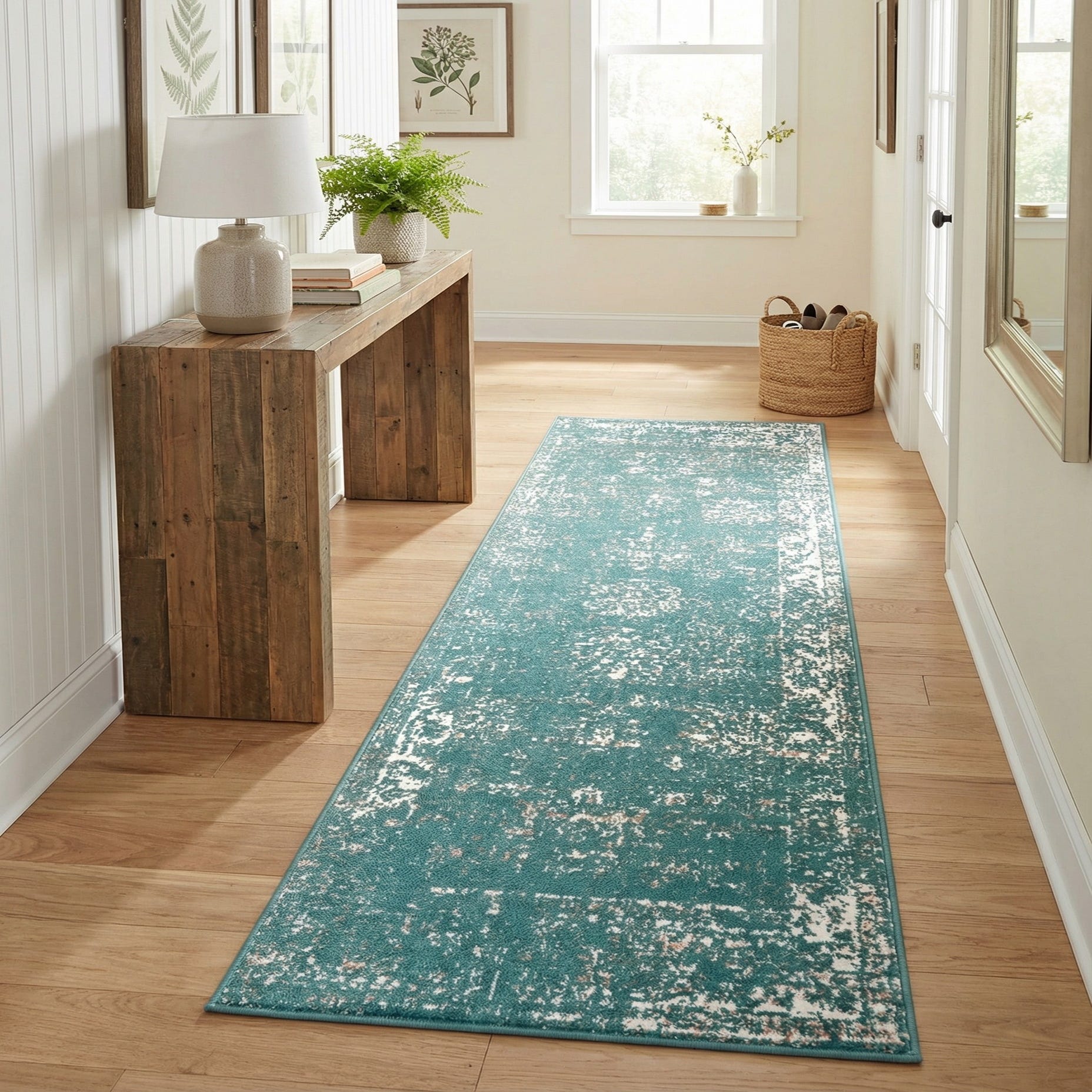 Primary color is Turquoise. Colors in this rug include: Turquoise, Gray, Ivory.