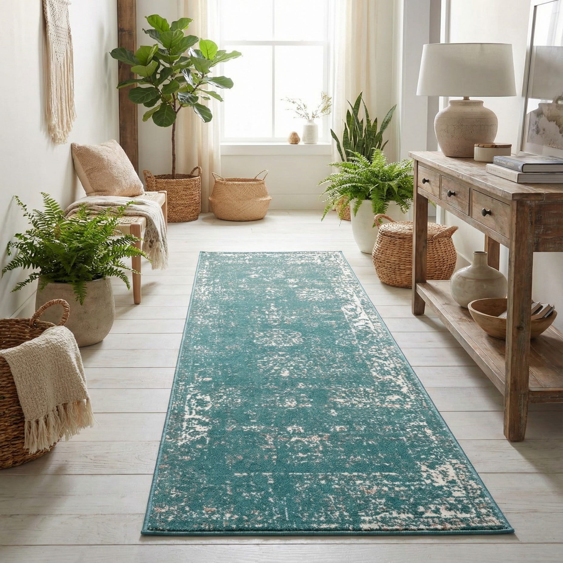 Primary color is Turquoise. Colors in this rug include: Turquoise, Gray, Ivory.