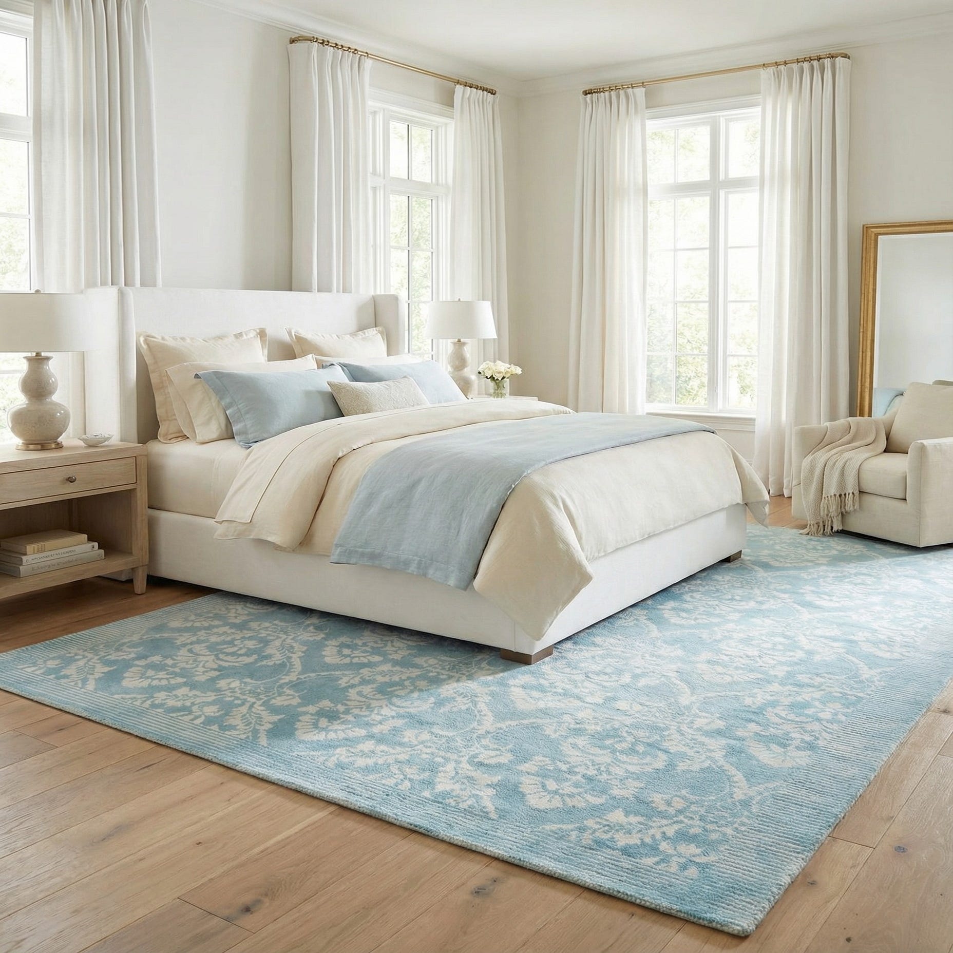 Primary color is Turquoise. Colors in this rug include: Turquoise, Blue, Ivory, Light Blue.