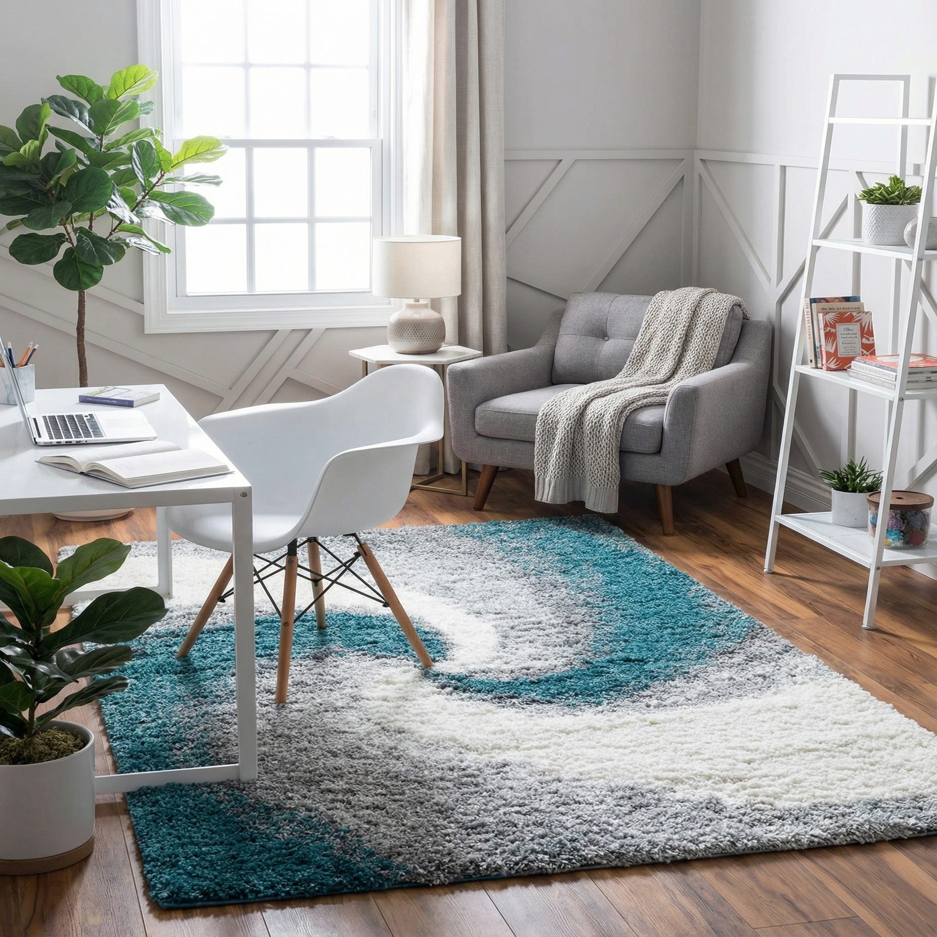 Primary color is Turquoise. Colors in this rug include: Turquoise, Gray, Ivory.