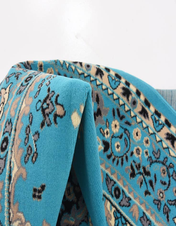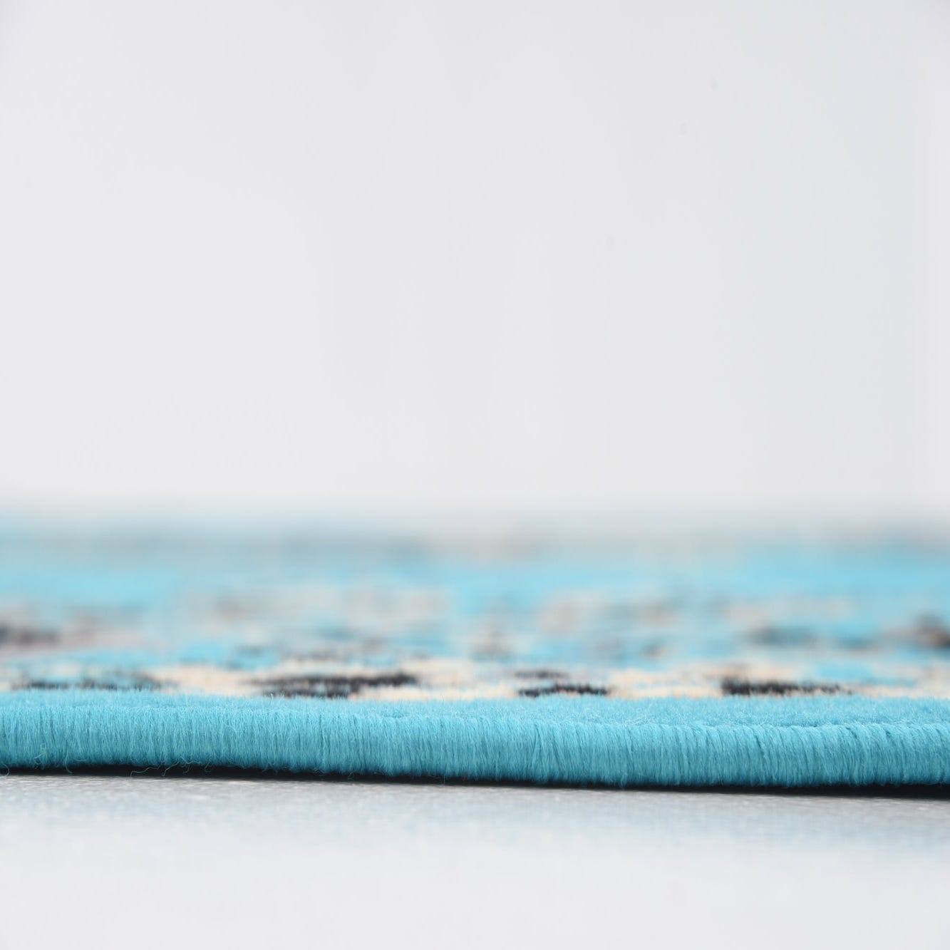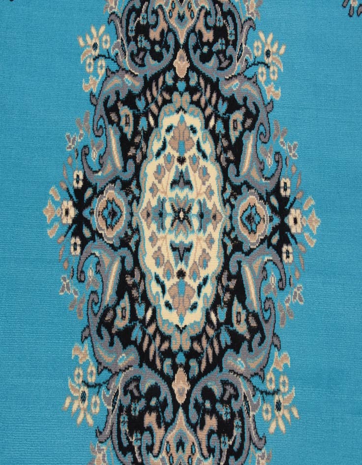 Primary color is Turquoise. Colors in this rug include: Turquoise, Black, Cream, Gray, Tan.