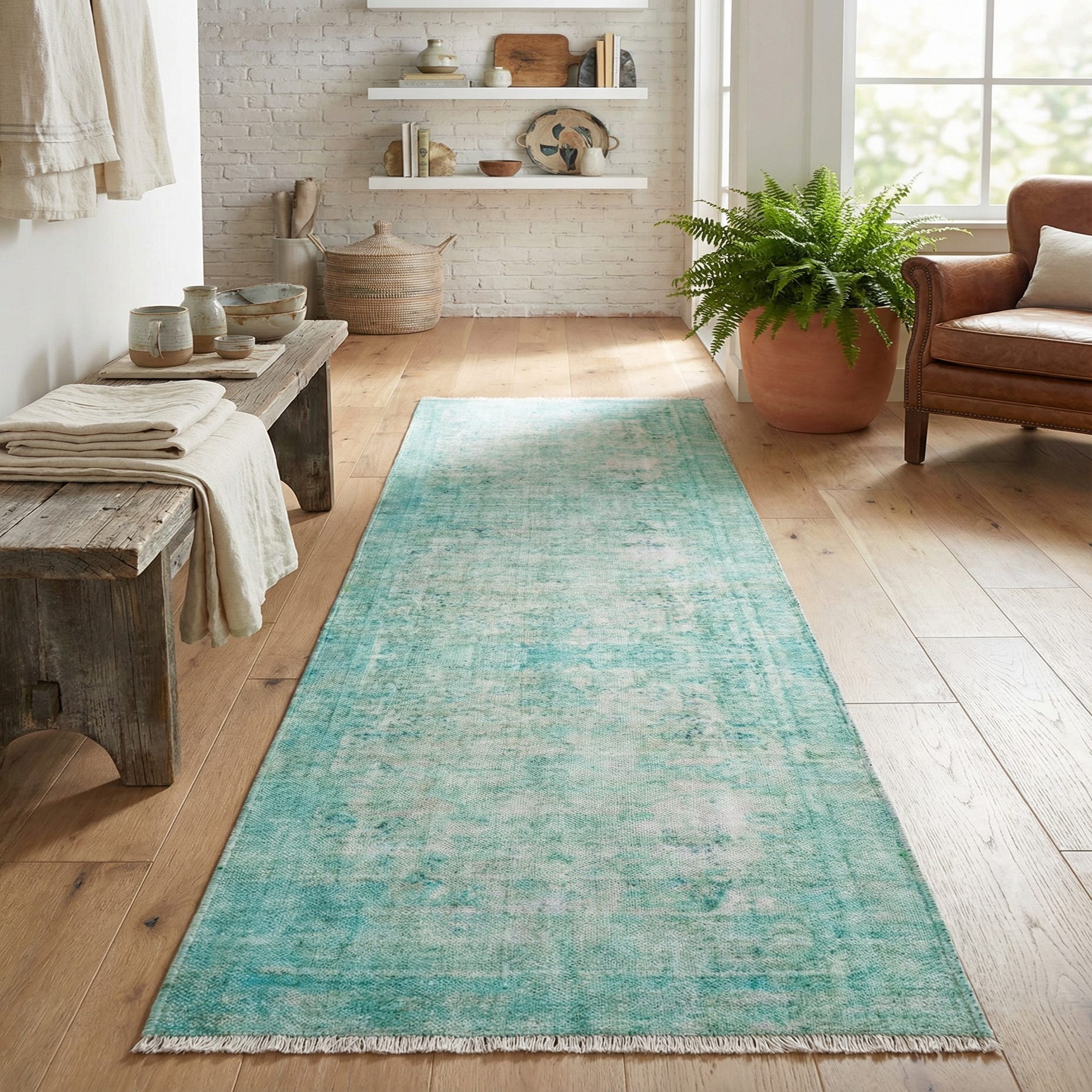 Primary color is Turquoise. Colors in this rug include: Turquoise, Brown, Navy Blue, Gray.