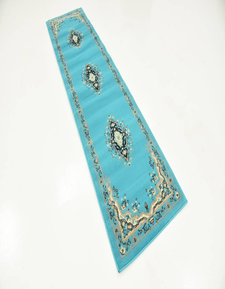 Primary color is Turquoise. Colors in this rug include: Turquoise, Black, Cream, Gray, Tan.