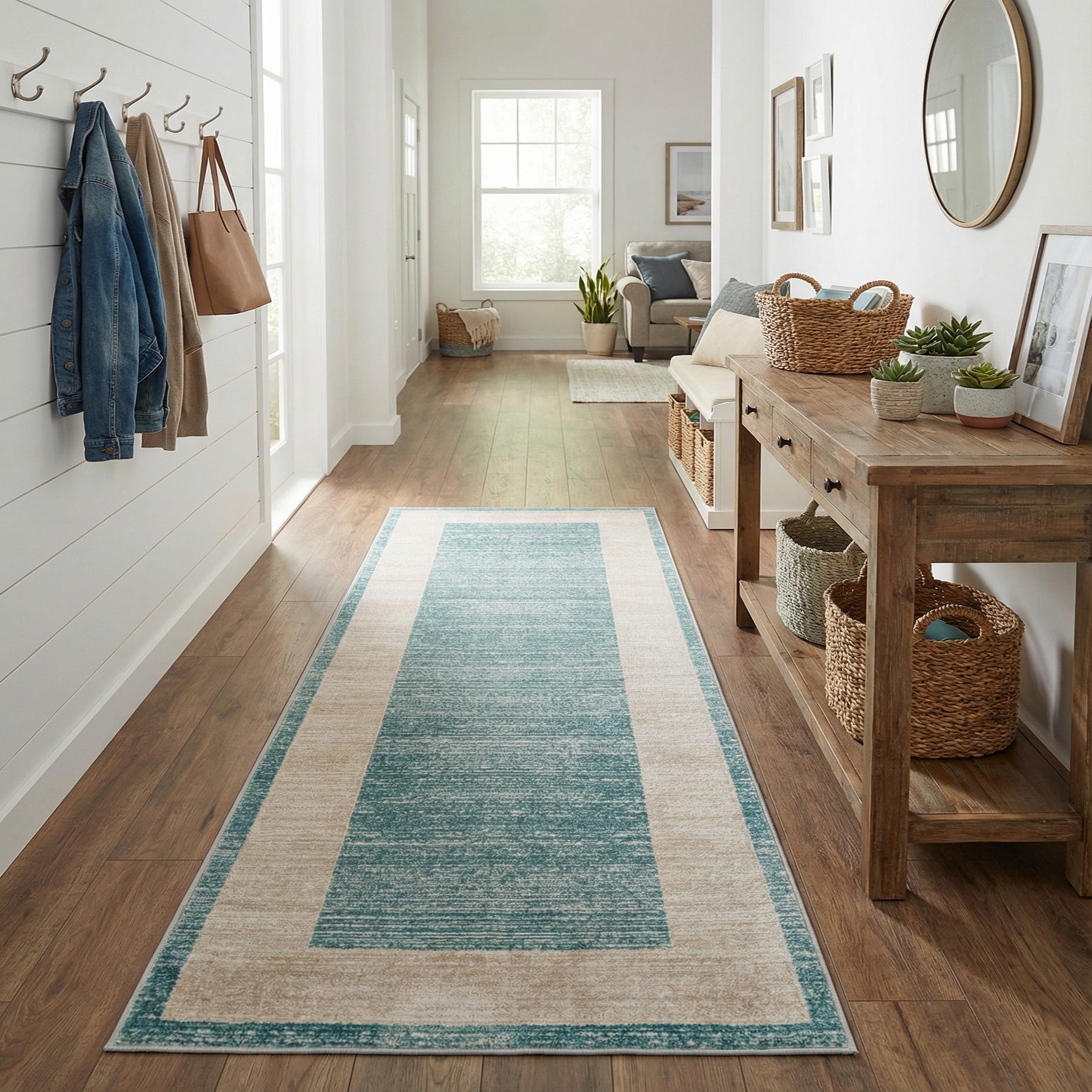 Primary color is Turquoise. Colors in this rug include: Turquoise, Ivory.