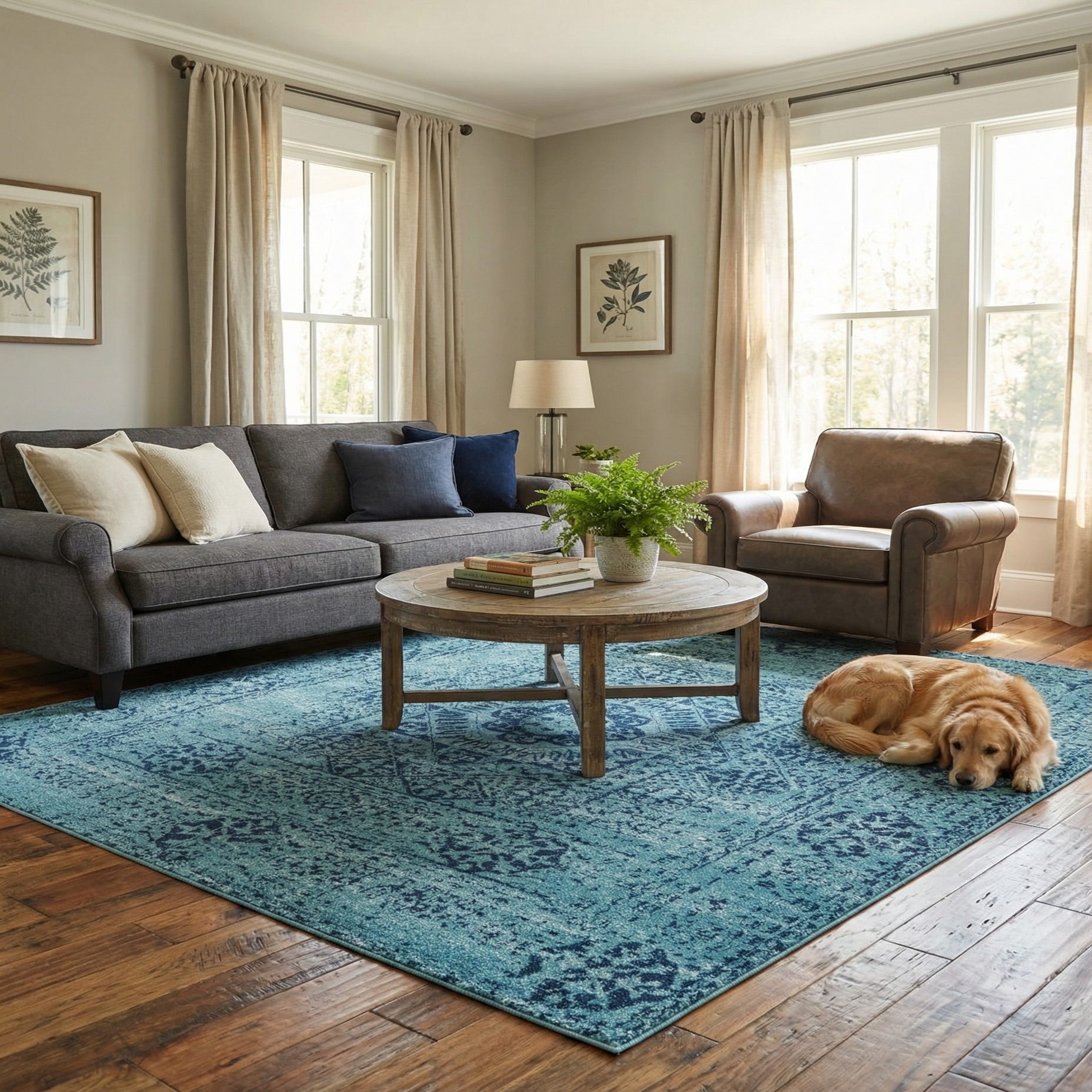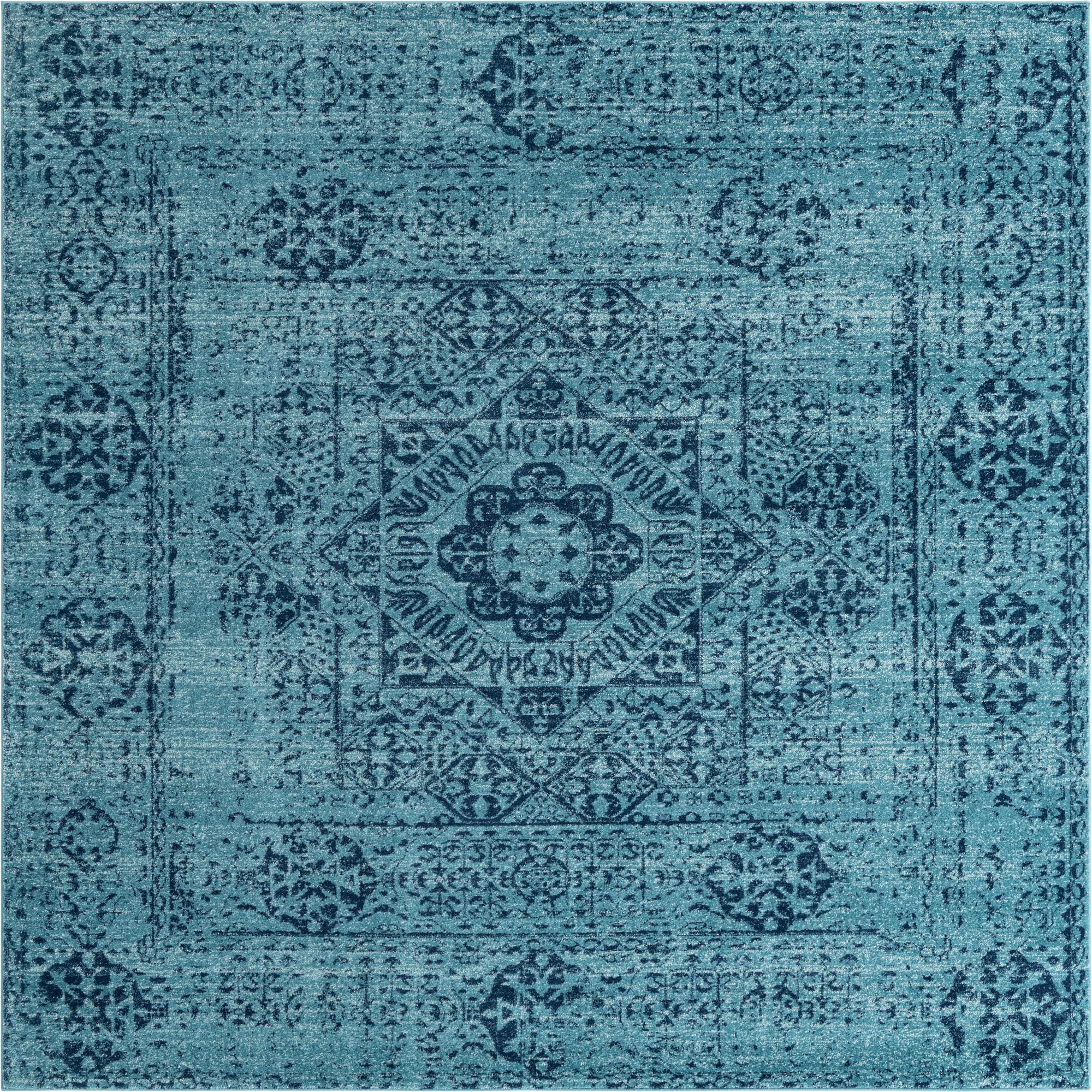 Primary color is Turquoise. Colors in this rug include: Turquoise, Navy Blue, Ivory.
