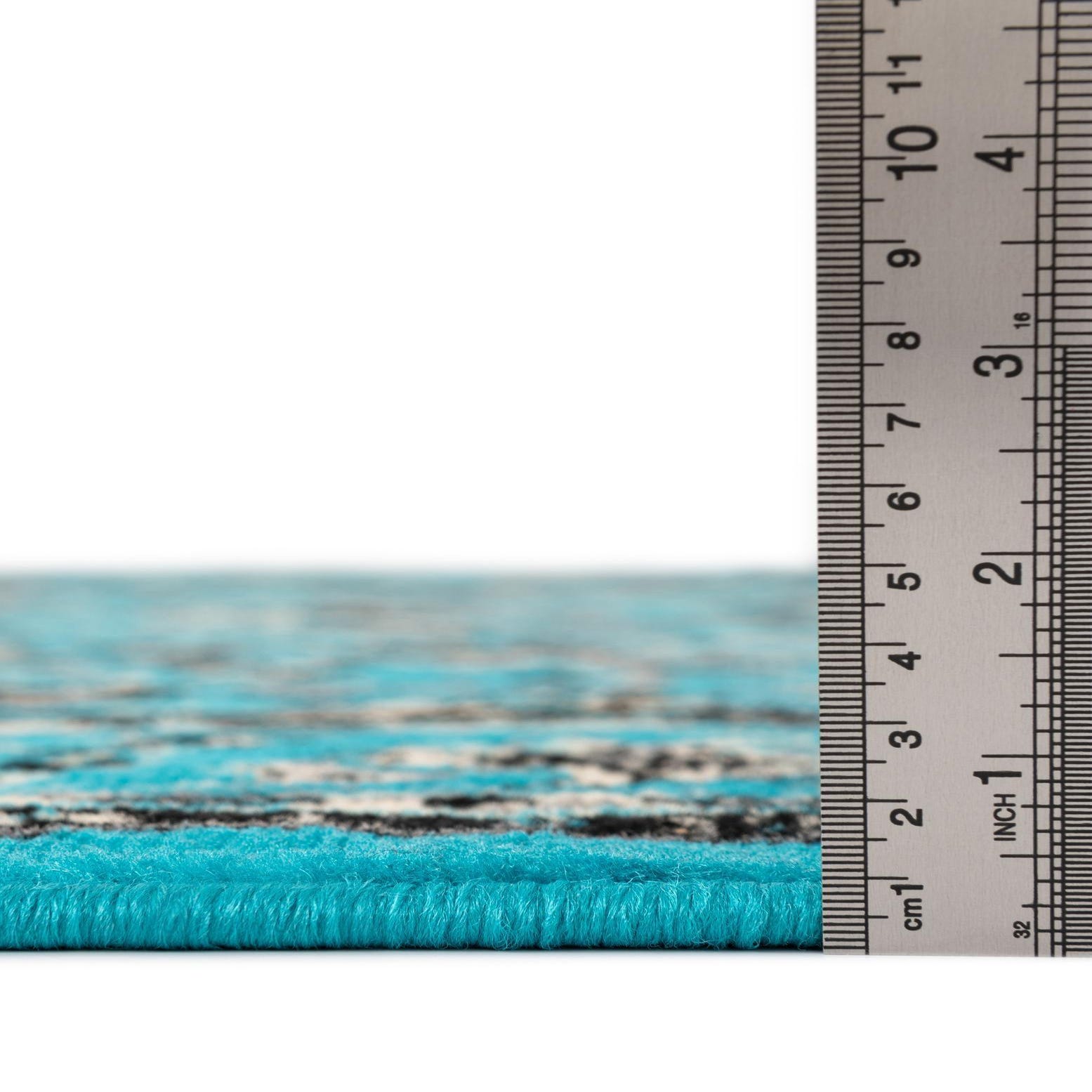 Primary color is Turquoise. Colors in this rug include: Turquoise, Black, Cream, Gray.