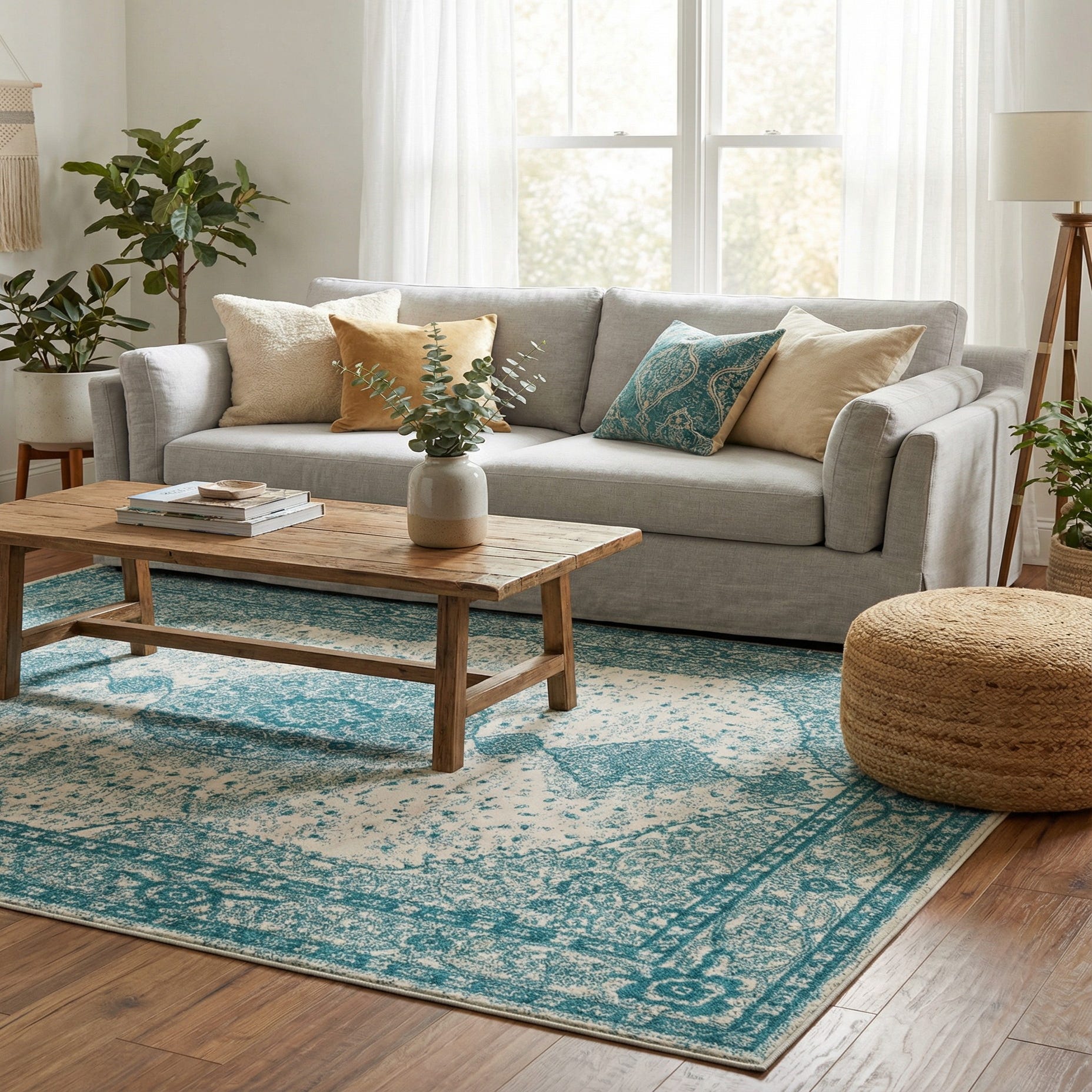 Primary color is Turquoise. Colors in this rug include: Turquoise, Ivory.